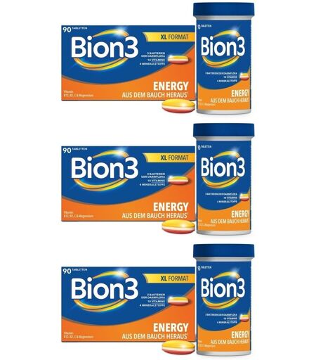 Nahrungsergänzungsmittel sind kein Ersatz für eine ausgewogene, abwechslungsreiche Ernährung und gesunde Lebensweise. Bion® 3 Energy Nahrungsergänzungsmittel mit 3 Tri-Bion® Bakterien der Darmflora, Vitaminen, Mineralstoffen und Ginsengextrakt Zutaten: L-Ascorbinsäure; Füllstoff: Cellulose; Inulin; Füllstoff: Calciumphosphate; Stabilisator: Hydroxypropylmethylcellulose; Magnesiumoxid; Stabilisator: Hydroxypropylcellulose; Dextrose; Maltodextrin; Stärke; Nicotinamid; Calcium D-pantothenat; Trennmittel: Magnesiumsalze der Speisefettsäuren, Siliciumdioxid, Mono- und Diglyceride von Speisefettsäuren; Eisensulphat; Riboflavin 5'-phosphate, Natrium; Füllstoffe: Polyvinylpyrrolidon, vernetzte Natriumcarboxymethylcellulose, Polyvinylpolypyrrolidon; Zinkoxid; Thiaminmononitrat; Ginsengwurzelextrakt (Panax ginseng C.A. Meyer); Pyridoxinhydrochlorid; Bakterien der Darmflora Lactobacillus gasseri PA 16/8, Bifidobacterium bifidum MF 20/5, Bifidobacterium longum SP 07/3 (Spuren von Milch, Fisch und Soja); Trägerstoff: Gummi arabicum; Zucker; Farbstoff: Eisenoxide und -hydroxide; Pteroylmonoglutaminsäure (Folsäure); D-Biotin; Kaliumiodid; Säureregulator: Citronensäure; Cholecalciferol; Cyanocobalamin. Nährwerte: Nährstoff pro Tablette Referenzmenge Thiamin (Vitamin B1)3,3 mg300% Riboflavin (Vitamin B2)4,2 mg300% Niacin20 mg NE125% Pantothensäure15 mg250% Vitamin B62,0 mg143% Biotin150 μg300% Folsäure200 μg100% Vitamin B122,5 μg100% Vitamin C180 mg225% Vitamin D5,0 μg100% Magnesium57,0 mg15% Eisen4,2 mg30% Zink5,0 mg50% Jod100 μg67% Ginseng-Extrakt10 mg- Bakterienkulturen10⁷ KBE***- Lactobacillus gasseri PA 16/8 Bifidobacterium bifidum MF 20/5 Bifidobacterium longum SP 07/3 ** Referenzmenge für die tägliche Zufuhr *** KBE: koloniebildende Einheiten Verzehrsempfehlung: Für Erwachsene (ab 18 Jahren): Eine Tablette täglich mit einem Glas Wasser zu oder direkt nach einer Mahlzeit einnehmen.. Empfohlene tägliche Verzehrsmenge nicht überschreiten. Nahrungsergänzungsmittel sind kein Ersatz für eine ausgewogene, abwechslungsreiche Ernährung und gesunde Lebensweise. Nicht empfohlen, wenn du eine Schwangerschaft planst, schwanger bist oder stillst. Frag deinen Arzt um Rat, wenn du Bluthochdruck hast, gerinnungshemmende Mittel einnimmst oder wegen Diabetes behandelt wirst, du Bedenken hast oder beabsichtigst, dieses Produkt zusammen mit anderen Nahrungsergänzungsmitteln oder Medikamenten einzunehmen. Nettofüllmenge: 3x90 Tabletten = 270 Tabletten = 320,4g Aufbewahrung: Dose fest verschlossen halten, kühl und trocken lagern. Vor Sonnenlicht schützen.. Außerhalb der Reichweite von Kindern aufbewahren. Hersteller: P&G Health Germany GmbH Sulzbacher Straße 40 65824 Schwalbach am Taunus ...