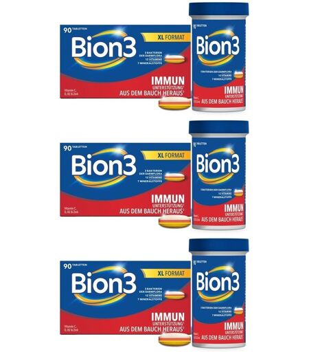 Nahrungsergänzungsmittel sind kein Ersatz für eine ausgewogene und abwechslungsreiche Ernährung und eine gesunde Lebensweise. Unterstütze deine natürlichen Abwehrkräfte mit dem neuen Bion3 Immun – Immun-Unterstützung¹ aus dem Bauch heraus²! Wusstest du, dass ein gesundes Immunsystem im Darm beginnt? Der Darm enthält 70% der körpereigenen Immunzellen und ist das Zentrum der Verdauung, wo essentielle Nährstoffe aufgenommen werden, um dein Immunsystem zu unterstützen. Das neue Bion3 Immun¹ kombiniert Bakterien der Darmflora, Vitamine und Mineralstoffe, die zur Unterstüzung des Darms² und zu einer normalen Funktion des Immunsystems beitragen¹. Jede Tablette enthält 12 Vitamine und 7 Mineralstoffe, inklusive Vitamin C, D und Zink, die zu einer normalen Funktion des Immunsystems beitragen. Vitamin C & Eisen trägt zur Verringerung von Ermüdung bei. Aber das ist noch nicht alles! Bion3 Immun¹ enthält Vitamin B2, Niacin & Biotin zur Unterstützung des Darms², sowie 10 Millionen Bakterien der Darmlora (L. gasseri, B. bifidum, B. Longum), die den Darm lebend erreichen. Für Erwachsene (ab 18 Jahren): Eine Tablette täglich mit einem kalten Getränk zu oder direkt nach einer Mahlzeit einnehmen. ¹ Vitamin C, D und Zink tragen zu einer normalen Funktion desImmunsystems bei. Eisen trägt zur Verringerung von Ermüdung bei. ² Vitamin B2, Niacin & Biotin tragen zur Erhaltung normaler Schleimhäute bei, z.B. im Darm. Der Darm enthält 70% der körpereigenen Immunzellen und ist das Zentrum der Verdauung, wo essentielle Nährstoffe aufgenommen werden, um dein Immunsystem zu unterstützen. Zutaten: Trennmittel: Calciumphosphate; Füllstoff: Cellulose; Ascorbinsäure; Magnesiumoxid; Inulin; DL-alpha-Tocopherylacetat; Überzugsmittel: Hydroxypropylmethylcellulose; Maltodextrin; Dextrose; Trennmittel: Mono- und Diglyceride von Speisefettsäuren; Nicotinamid; Füllstoff: Polyvinylpyrrolidon; Überzugsmittel: Hydroxypropylcellulose; Stärke; Eisensulfat; modifizierte Stärke; Zinkoxid; Füllstoff: Polyvinylpolypyrrolidon; Trennmittel: Magnesiumsalze der Speisefettsäuren; Calcium-Dpantothenat; Füllstoff: vernetzte Natriumcarboxymethylcellulose; Pyridoxinhydrochlorid; Thiaminmononitrat; Riboflavin; Farbstoff: Eisenoxide und Eisenhydroxide; Trennmittel: Siliciumdioxid; Bakterienkulturen (Lactobacillus gasseri PA 16/8, Bifidobacterium bifidum MF 20/5, Bifidobacterium longum SP 07/3)*; Mangansulfat; Retinylacetat; Zucker; Folsäure; DBiotin; Kaliumiodid; mittelkettige Triglyceride (aus Palmöl); Chrom-(III)-chlorid; Natriumselenat; Cholecalciferol; Cyanocobalamin. * Kann Spuren von Milchprotein, Fisch und Soja enthalten Nährwerte:Nährwertangabenpro TabletteReferenzmenge**Vitamin A (RE)800 µg100 %Vitamin D10 µg200 %Vitamin E (α-TE)10 mg83 %Vitamin C120 mg150 %Thiamin (Vitamin B1)1,4 mg127 %Riboflavin (Vitamin B2)1,6 mg114 %Niacin (NE)18 mg113 %Vitamin B62 mg143 %Folsäure300 µg150 %Vitamin B123 µg120 %Biotin150 µg300 %Pantothensäure6 mg100 %Magnesium56,25 mg15... ...