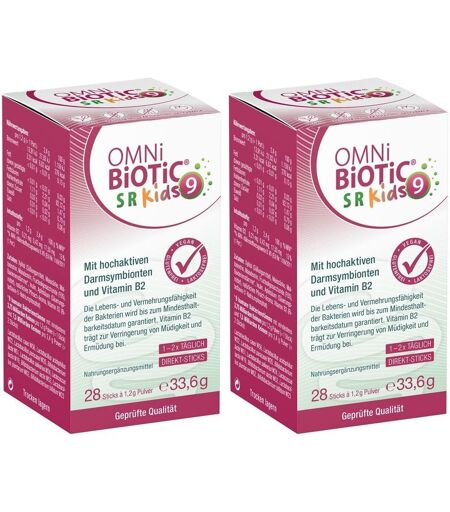 Nahrungsergänzungsmittel sind kein Ersatz für eine ausgewogene und abwechslungsreiche Ernährung und eine gesunde Lebensweise.Set enthält2x OMNi-BiOTiC SR-9 Kids – 28 Beutel mit wertvollen Bakterienstämmen 28x1,2 gOMNi-BiOTiC SR-9 Kids – 28 Beutel mit wertvollen BakterienstämmenDas OMNi-BiOTiC SR-9 Kids ist ein speziell entwickeltes Probiotikum für Kinder, das 9 wissenschaftlich geprüfte Bakterienstämme mit Vitamin B2 kombiniert. Ideal für den täglichen Einsatz – die innovativen Direkt-Sticks können ohne Wasser eingenommen werden und lösen sich direkt im Mund auf. Perfekt für Schule und Alltag!Zutaten:9 Bakterienstämme (Lactobacillus & Bifidobacterium-Spezies)Vitamin B2 (Riboflavin)Weitere Inhaltsstoffe: Maltodextrin, Aroma, SüßungsmittelNährwertangaben: Nährwerte Energie kJ/kcal - Vitamin B2 mg - Bakterienstämme CFU - Verzehrsempfehlung:Kinder ab 3 Jahren: Täglich 1–2 Direkt-Sticks einnehmen.Sticks einfach entlang der Perforation aufreißen und den Inhalt direkt im Mund zergehen lassen.Aufbewahrungs- & Verwendungshinweis:Nicht für Kinder unter 3 Jahren geeignetDie empfohlene Tagesmenge nicht überschreitenKühl, trocken & lichtgeschützt lagernNettofüllmenge:28 x 1,2 g BeutelHestellerdaten:INSTITUT ALLERGOSAN Deutschland (privat) GmbHMozartstraße 153115 Bonn, Deutschland ...
