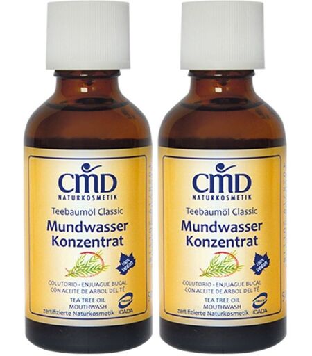 Set enthält2x CMD Teebaumöl Classic Mundwasser Konzentrat 50 mlTeebaumöl Mundwasser KonzentratDieses Mundwasser ist besonders bei empfindlichen Zahnhälsen geeignet.Die erfrischenden Wirkstoffe Thymianöl, Bio Pfefferminzöl und Bio Teebaumöl sorgen für eine gesunde Mundflora.Dieses Produkt ist 100% vegan.Entspricht den Richtlinien zertifizierter Naturkosmetik.Hinweis:Nur Original Teebaumöl aus Australien wird verwendet, welches CMD Naturkosmetik® auch direkt aus Australien bezieht. Gegenüber dem preisgünstigeren Teebaumöl aus Asien zeichnet sich das australische Teebaumöl durch eine sehr hohe Qualität aus. Anwendung2-5 Tropfen in ein halbes Glas Wasser geben und den Mund damit spülen.INGREDIENTS: Alcohol, Aqua, Thymus Serpyllum Oil, Parfum, Menthol, Mentha Piperita Oil*, Melaleuca Alternifolia Oil*, Commiphora Myrrha Oil (*Raw materials certified organic) Contains: Limonene, Linalool, Citral DEUTSCHE DEKLARATION: Weingeist, Wasser, Thymianöl, Mischung ätherischer Öle, Menthol, Pfefferminzöl*, Teebaumöl*, Myrrhenöl (*Rohstoffe aus kontrolliert biologischem Anbau) Bestandteile ätherischer Öle: Limonene, Linalool, Citral ...