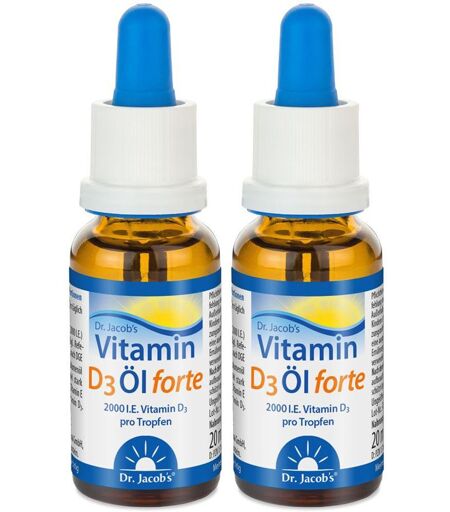 Nahrungsergänzungsmittel sind kein Ersatz für eine ausgewogene und abwechslungsreiche Ernährung und eine gesunde Lebensweise. Vitamin D Tropfen für Immunsystem, Muskeln und Knochen* Vitamin D3 Tropfen hochdosiert: pro Tropfen 50 µg Vitamin D3 = 2000 I.E. Mit Vitamin D aus Deutschland in Arzneibuchqualität, vegetarisch Längste Erfahrung: Das erste Vitamin D3 Öl in deutschen Apotheken (seit 2013) Optimal bioverfügbar und stabil durch MCT-Trägeröl (aus Kokos) und natürliche Vitamin E-Familie Ideal zu dosieren dank Glaspipette Sehr gutes Preis-Dosis-Verhältnis: 640 Portionen Von der Apotheken-Marke Dr. Jacob’s (seit 1997) 20 ml (640 Tropfen à 2000 I.E. Vitamin D3) Vitamin D Öl – für Abwehrkräfte* und vermindertes Sturzrisiko** *Das in Dr. Jacob’s Vitamin D3 Öl forte enthaltene Vitamin D3 leistet einen wissenschaftlich gesicherten Beitrag zu folgenden normalen Körperfunktionen: Immunsystem Erhaltung von Muskeln Erhaltung von Knochen und Zähnen Unterstützung der normalen Zellteilung Insbesondere ab 60 Jahren sind Stürze bei Männern und Frauen ein Risikofaktor für Knochenbrüche. Ein im Alter erhöhtes Sturzrisiko kann in Zusammenhang mit der Vitamin-D-Versorgung stehen. **Die tägliche Einnahme von 800 I.E. Vitamin D aus allen Quellen führt ab 60 Jahren zu einer Verminderung des Sturzrisikos in Zusammenhang mit körperlicher Instabilität und Muskelschwäche. Nicht nur Vitamin D3 trägt zur Erhaltung normaler Knochen bei, sondern auch Vitamin K2. Beide wirken synergistisch und sollten am besten kombiniert aufgenommen werden, wie z. B. in Dr. Jacob’s Vitamin D3K2 Öl forte. Wann sollten Sie Vitamin D hochdosiert einnehmen? Die Vitamin-D-Versorgung durch die Ernährung ist begrenzt und die körpereigene Bildung abhängig von ausreichender Sonnenexposition. In den Herbst- und Wintermonaten kann dies zu niedrigen Vitamin-D-Spiegeln führen, weshalb eine höhere Zufuhr empfohlen wird. Vitamin D hat dank überzeugender Studienergebnisse im letzten Jahrzehnt stark an Bedeutung gewonnen. Allein die Deutsche Gesellschaft für Ernährung (DGE) hat ihre Zufuhrempfehlung auf täglich 20 µg (800 I.E.) Vitamin D vervierfacht. Das Ziel der DGE ist es dabei, Vitamin-D-Werte im Serum von über 50 nmol/l zu erreichen. Für viele Experten und Institutionen sind diese Zahlen aber nicht ausreichend. Nur 12 % haben gute Vitamin-D3-Werte Einen von der Endokrinen Gesellschaft (eine der ältesten und wichtigsten medizinischen Organisationen der Welt) und von diversen Experten als gut angesehenen Vitamin-D-Spiegel von über 75 nmol/l haben gerade einmal 12 % der deutschen Bevölkerung.*** Die Endokrine Gesellschaft empfiehlt Erwachsenen die tägliche Einnahme von 37,5–50 µg (1500–2000 I.E.) Vitamin D. Die renommierte US-Ärztegesellschaft für Altersmedizin empfiehlt allen Personen ab 70 Jahren sogar täglich 100 μg (4000 I.E.) Vitamin D aufzunehmen, um Vitamin-D-Spiegel von ≥ 75 nmol/l zu erzielen. Das entspricht der von der Europäischen Behörde für Lebensmittelsicherheit (EFSA) als sicher... ...