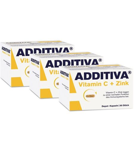 Nahrungsergänzungsmittel sind kein Ersatz für eine ausgewogene und abwechslungsreiche Ernährung und eine gesunde Lebensweise. ADDITIVA® Vitamin C + Zink Depot 300 mg KapselnDepot-Kapseln mit 9 Stunden Retard-Effekt. Trägt zu einer normalen Funktion des Immunsystems bei.Das bekannteste Vitamin ist sicher Vitamin C. Ein wahres Multitalent ist es sowieso: Es stärkt das Immunsystem, schützt das Auge von innen, bewahrt Gefäße vor dem Angriff freier Radikale, stabilisiert Muskeln, Gelenke, Haut und Knochen und begünstigt die Aufnahme von Eisen in den Körper. Auch Zink ist ein wahrer Powerstoff. Dieses Spurenelement reguliert den Hormonhaushalt, sorgt für gesunde Zellen und hilft bei Hautproblemen. Es beeinflusst den Geruchs- und Geschmackssinn, regt den Appetit an und fördert die Gedächtnisleistung. Und: Eine optimale Zinkversorgung stärkt die Abwehr und beugt Infekten vor. Ist das Immunsystem durch besondere Belastungen oder Erkrankungen geschwächt oder soll es allgemein gestärkt werden, können Kapseln und Tabletten mit Depoteffekt – wie ADDITIVA Vitamin C + Zink unterstützend wirken.Zutaten:Vitamin C, Gelatine, Füllstoff mikrokristalline Cellulose, Überzugsmittel Schellack, Zinksulfat, Füllstoff Hydroxy-Propylmethylcellulose, Trennmittel Speisefettsäuren, Trennmittel Talkum, Farbstoff Riboflavin-5-Phosphat Vitamine und Mineralstoffepro Kapsel (0,475 g)% NRV* pro KapselVitamin C300 mg375Zink5,0 mg50Verzehrsempfehlung:1-mal täglich 1 Kapsel mit etwas Flüssigkeit einnehmenHinweis:Die angegebene empfohlene tägliche Verzehrsmenge darf nicht überschritten werden. Schwangere Frauen sollten vor Beginn des Verzehrs ihren Arzt fragen. Nicht für Kinder und Jugendliche unter 18 Jahren. Aufbewahrung:Außerhalb der Reichweite von kleinen Kindern lagern. Trocken lagern.Nettofüllmenge:3 x 60 Kapseln1 Kapsel enthält 300 mg Vitamin C und 5 mg ZinkHerstellerdaten:Dr. B. Scheffler Nachfolger GmbH & Co. KGSenefelderstr. 4451469 Bergisch Gladbach ...