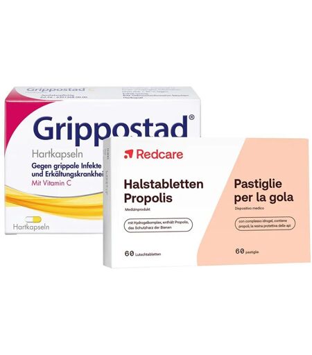 GRIPPOSTAD® C + Redcare Halstabletten Propolis Im Set enthalten: GRIPPOSTAD® C Redcare Halstabletten Propolis GRIPPOSTAD® C - SCHNELLE LINDERUNG VON ERKÄLTUNGSSYMPTOMEN MIT DER NR. 1 UNTER DEN ERKÄLTUNGSMITTELN 1 Erkältungen sind meist Virusinfektionen der Atemwege, die sich auf den ganzen Körper auswirken können. Viele Erkältete leiden bei einer Erkältung gleichzeitig an Schnupfen, Kopf- und Gliederschmerzen, Husten und Fieber. Alle diese Erkältungsbeschwerden gemeinsam können mit einem Kombi-Präparat bekämpft werden. Grippostad® C Kapseln sind Deutschlands meistverwendete Erkältungsmedizin bei Erkältungskrankheiten und grippalen Infekten. Die einzigartige Wirkstoffkombination aus Paracetamol, Chlorphenamin und Coffein wirkt lindert schnell gemeinsam auftretende Erkältungssymptome wie Reizhusten, Erkältungsfieber, Kopf- und Gliederschmerzen und Schnupfen – und enthält zusätzlich Vitamin C zur Unterstützung des Immunsystems. PRODUKTPROFIL Schnell und stark bei Reizhusten, Kopf- und Gliederschmerzen, Schnupfen und Fieber Einzigartige 4er-Wirkstoffkombination mit Vitamin C für das Immunsystem Bewährte, gut schluckbare Hartkapseln SO WIRKT DIE 4ER WIRKSTOFFKOMBINATION: Paracetamol hilft Kopf- und Gliederschmerzen zu lindern und das Fieber zu senken. Chlorphenamin trägt zu einer Verminderung der Nasenschleimproduktion bei und erleichtert dadurch das Durchatmen. Gleichzeitig lindert es den Reizhusten und hemmt die übermäßige Schleimsekretion. Coffein verstärkt den Effekt von Paracetamol und wirkt belebend. Vitamin C unterstützt das Immunsystem. CLEVER KOMBINIERT UND GUT VERTRÄGLICH Grippostad® ist gut verträglich. Die Dosierung der Wirkstoffe in Grippostad® C ist so abgestimmt, dass mit einem Minimum an Wirkstoff ein Maximum an Wirkung erzielt wird. ANWENDUNGSEMPFEHLUNG: Kinder ab 12 Jahren und Erwachsene können dreimal täglich zwei Grippostad® C Kapseln einnehmen. Die Einnahme sollte mit etwas Flüssigkeit, beispielsweise einem Glas Wasser, erfolgen. GUT ZU WISSEN: Grippostad® C Kapseln sind auch für Asthmatiker geeignet. Einzige Ausnahme ist ein Asthma, das durch Arzneimittel (vor allem Schmerzmittel) ausgelöst ist. Diabetiker und Patienten mit Bluthochdruck können das Medikament ebenfalls einnehmen, sofern sie eine gesunde Nierenfunktion haben. Grippostad® C Kapseln sind für ihre rasche Wirkung und gute Verträglichkeit bekannt. Immerhin würden 95,3% der Patienten sie wieder verwenden.** Wenn Sie schwanger sind oder stillen, dürfen Sie Grippostad® C nicht einnehmen. HÄUFIGE FRAGEN & ANTWORTEN Gegen welche Beschwerden hilft Grippostad® C? Grippostad® C Kapseln können immer dann helfen, wenn bei einer Erkältung die Erkältungsbeschwerden Kopf- und Gliederschmerzen, Schnupfen, Fieber und Reizhusten gemeinsam auftreten. Welche Wirkstoffe sind in Grippostad® C Kapseln enthalten? Die Kapseln enthalten 200 Milligramm Paracetamol, 2,5 Milligram Chlorphenaminmaleat, 25 Milligramm Coffein und 150 Milligramm Ascorbinsäure (Vitamin C). Wie wirkt Grippostad®... ...