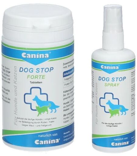 Canina® Dog-Stop Spray + Canina® Dog-Stop forte Tabletten Im Set enthalten: Canina® Dog-Stop 100 ml Canina® Dog-Stop forte 60 Tabletten Canina® Dog-Stop Ab dem Auftreten erster Anzeichen einer Läufigkeit/Rolligkeit ist DOG STOP SPRAY täglich anzuwenden. Dabei werden die hinteren Körperteile der Hündin/Katze, die Innenseite der Hinterläufe und dem Schwanzansatz von allen Seiten gründlich besprüht. Diese Körperpartien sind durch das Sekret der Läufigkeit/Rolligkeit besonders beansprucht und verklebt und riechen daher unangenehm.DOG STOP SPRAY pflegt diese Partien und nimmt den Geruch.Um unerwünschtes Markieren zu vermeiden, werden die entsprechenden Stellen mit DOG STOP SPRAY wiederholt eingesprüht. Der intensive Geruch nach Eukalyptus verhindert erneutes Markieren. Ingredients (INCI):Isopropyl alcohol, paraffi num liquid, butylene glycol, eucalyptus Oil, isobornyl-acetate, p-chloro-m-cresol Anwendungsempfehlung: Die Anwendung ist während der ganzen Zeit der Läufigkeit/Rolligkeit durchzuführen. Die Kombination mit DOG STOP Forte Tabletten (die gegen die Entwicklung des Duftstoffes der Läufigkeit/Rolligkeit wirken) ist optimal. Voraussetzung für eine gute Wirkung ist die rechtzeitige und regelmäßige Anwendung von DOG STOP. Nicht auf die Augen oder Nase der Hündin sprühen. DOG STOP SPRAY kann auch verwendet werden: vor dem Auslaufbei Ausstellungbei Anwesenheit von Rüden/Katern Pumpspray ohne Treibgas. Vor Gebrauch kurz schütteln. Nach jeder Anwendung Flasche auf den Kopf stellen und Ventil leer sprühen. R-Sätze: R43: Sensibilisierung durch Hautkontakt möglich S-Sätze: S2: Darf nicht in die Hände von Kindern gelangen S24/25: Berührung mit der Haut und Augen vermeiden S46: Bei Verschlucken sofort ärztlichen Rat einholen und Verpackung oder Etikett vorzeigen S64: Bei Verschlucken Mund mit Wasser ausspülen (nur wenn Verunfallter bei Bewusstsein ist) Hinweis:Enthält Eukalyptusöl und Chlorkresol. Kann allergische Reaktionen hervorrufen. Canina® Dog-Stop forte Ergänzungsfuttermittel zum Schutz läufiger Hündinnen Hält den Rüden fern!Jeder Hundeliebhaber, vor allem aber Hundezüchter, ist während der Läufigkeit seiner Hündin - der Hitzeperiode - in Angst und Sorge Seine Hündin, vielleicht ein wertvolles Zuchttier, ist den unerwünschten Belästigungen durch Rüden ausgesetzt, die sie überall verfolgen. Wie leicht kann es da zu ungewolltem und unerwünschtem Nachwuchs kommen. Davor will der Hundehalter sich und sein Tier schützen. Durch Geruchsstoffe, die die Hündin in dieser Zeit durch den Harn ausscheidet, lockt sie die Rüden an.Sie ist in eine Wolke von erotisierendem Duft gehüllt und hinterlässt damit sichere Markierungszeichen, die von männlichen Tieren angenommen werden. Die Unannehmlichkeiten, die bei der Hündin die Hitzeperiode, besonders durch die Belästigung durch Rüden alle sechs Monate mit sich bringt, haben bisher viele Hundefreunde vom Kauf einer Hündin abgehalten. Dog Stop kann das leidige Problem der... ...