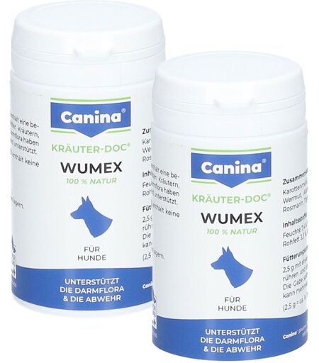 Canina® Kräuter-Doc® Wumex Canina KRÄUTER-DOC® Wumex enthält eine Mischung aus ausgesuchten Kräutern. Als Trägerstoff dient naturreines Karottenmehl. Diese besondere Kombination schafft ein ausgeglichenes Milieu im Darm und die darmeigene Abwehr wird unterstützt. Canina KRÄUTER-DOC® WUMEX enthält keine chemischen Zusätze – 100 % Natur! Fütterungsempfehlung pro Tier und Tag: 2,5 g pro Tier und Tag mit dem Futter vermischen, über 10 Tage (2,5 g = ca. ½ Teelöffel). Diese 10-Tage-Einnahme vierteljährlich wiederholen (4 x im Jahr). Während der Trächtigkeit absetzen! Zusammensetzung Karottenmehl, Petersilie, Kürbissamen, Salbei, Wermut, Alantwurzel, Pfefferminze, Oregano, Rosmarin, Thymian, Zimt Analytische Bestandteile Feuchte 7,4 %, Rohprotein 15,7 %, Rohfaser 15,7 %, Rohfett 3,3 %, Rohasche 9,0 % ...