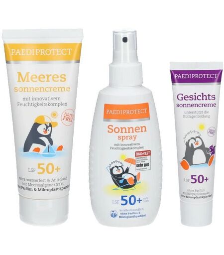 Meeressonnencreme + Sonnenspray + PAEDIPROTECT Gesichtssonnencreme Im Set enthalten: Meeressonnencreme LSF 50+ Sonnenspray LSF 50+ PAEDIPROTECT Gesichtssonnencreme Meeressonnencreme LSF 50+ Die Meeressonnencreme kombiniert sehr hohen UV-Schutz mit Wasserfestigkeit und Anti-Sand-Formel – perfekt für Strand, Meer & Planschbecken. Die Meeressonnencreme bietet sehr hohen, wasserfesten UV-Schutz für den Sommer. Moderne, hautverträgliche UV-Filter mit Lichtschutzfaktor 50+ auf organischer Basis schützen die Haut zuverlässig vor UVA/UVB-Strahlung – ganz ohne Nanopartikel. Der innovative Feuchtigkeitskomplex mit Meeresalgenextrakt pflegt die Haut zusätzlich. Die Creme ist einfach aufzutragen, zieht schnell ein und reduziert deutlich das Kleben von Sand auf der Haut. Damit ihr ohne Bedenken im Meer schwimmen könnt, verzichten wir der Umwelt zu Liebe auf Mikroplastik und Octocrylene. Anwendung: Trage vor dem Gang ins Freie die Meeressonnencreme großzügig auf Gesicht und Hals auf. Kinder benötigen etwa einen Teelöffel Produkt pro Körperregion, Erwachsene etwa einen Esslöffel. Geringe Auftragsmengen verringern den Schutz erheblich. Spätestens alle 2 Stunden und unmittelbar nach dem Schwitzen, Schwimmen oder Abtrocknen solltet ihr nachcremen, um den Schutz aufrecht zu erhalten. Babys und Kleinkinder sollten nicht der direkten Sonne ausgesetzt werden und zudem schützende Kleidung tragen. Die intensive Mittagssonne solltet ihr als Familie grundsätzlich meiden. Um dauerhafte Flecken vorzubeugen, solltet ihr den Kontakt mit Textilien und Oberflächen meiden. Am besten erst eincremen, kurz einziehen lassen und erst dann anziehen. Auch Sonnenschutzmittel mit hohen Lichtschutzfaktoren bieten keinen vollständigen Schutz vor UV-Strahlen. Übermäßiges Sonnenbaden erhöht langfristig das Krebsrisiko und kann zu frühzeitiger Hautalterung führen. Nicht auf offene Hautstellen auftragen und Kontakt mit den Augen vermeiden. Inhaltsstoffe: AQUA, C12-15 ALKYL BENZOATE, DIBUTYL ADIPATE, DIETHYLAMINO HYDROXYBENZOYL HEXYL BENZOATE, PHENYLBENZIMIDAZOLE SULFONIC ACID, BIS-ETHYLHEXYLOXYPHENOL METHOXYPHENYL TRIAZINE, ETHYLHEXYL TRIAZONE, POLYGLYCERYL-3 POLYRICINOLEATE, METHYLPROPANEDIOL, ORYZA SATIVA BRAN CERA, CAPRYLIC/CAPRIC TRIGLYCERIDE, SODIUM CHLORIDE, HYDROGENATED CASTOR OIL, ZINC STEARATE, SODIUM HYDROXIDE, CAPRYLYL GLYCOL, SIMMONDSIA CHINENSIS SEED OIL, SODIUM POLYPHOSPHATE, BISABOLOL, LAMINARIA OCHROLEUCA EXTRACT, PHENYLPROPANOL Sonnenspray LSF 50+ Das Sonnenspray LSF50+ verbindet sehr hohen UV-Schutz mit einfacher Anwendung für den ganzen Körper – perfekt für unterwegs. Das Sonnenspray ist ideal für unterwegs und verbindet sehr hohen Schutz mit einfacher Anwendung für den ganzen Körper. Die leichte Formulierung lässt sich einfach verreiben, zieht schnell ein und klebt nicht. Außerdem wird die Haut durch den innovativen Feuchtigkeitskomplex gepflegt und trocknet nicht aus. So sind die Kids in Windeseile eingecremt und dank moderner, hautverträglicher UV-Filter mit LSF 50+... ...