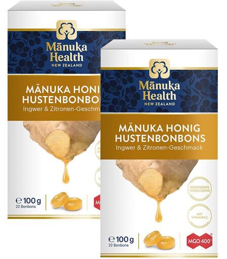 Bitte achten Sie auf eine abwechslungsreiche und ausgewogene Ernährung und gesunde Lebensweise.Manuka Health MGO 400+ Manuka-Honig Hustenbonbons Ingwer-Zitrone MGO 400+ Manuka Ingwer-Zitrone Hustenbonbons mit der wohltuend wärmenden Schärfe von Ingwer und fruchtigem Zitronengeschmack! 100% natürliche Zutaten. Zutaten:Rohrzucker, Glukosesirup, MGO 400+ Manuka-Honig (Leptospermum scoparium, 8%), Wasser, natürliches Aroma (Schwarze Johannisbeere), Rohrzucker, Glukosesirup, MGO 400+ Manuka-Honig (Leptospermum scoparium, 8%), Wasser, Ingwerextrakt, Zitronenöl, Vitamin C Nährwertangaben: Durchschnittliche Nährwerte:pro 100 g Energie1690 kJ / 404 kcal Fett- davon gesättigte Fettsäuren0,2 g 0,1 g Kohlenhydrate- davon Zucker 99 g 71 g Eiweiß0,3 g Salz 0,1 g Verzehrempfehlung:Kann nach Bedarf eingenommen werden.Hinweis:Die angegebene Verzehrmenge darf nicht überschritten werden.Aufbewahrung:Kühl und trocken lagern und außerhalb der Reichweite von Kindern aufbwahrenNettofüllmenge2 x 100 gHerstellerHager Pharma GmbHAckerstraße 147269 Duisburg ...