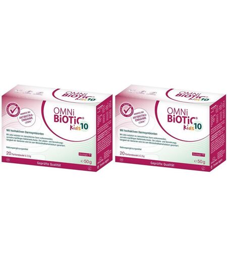 Nahrungsergänzungsmittel sind kein Ersatz für eine ausgewogene und abwechslungsreiche Ernährung und eine gesunde Lebensweise.Wie funktioniert OMNi-BiOTiC® 10 Kids?OMNi-BiOTiC® 10 Kids enthält dieselbe wissenschaftlich geprüfte Bakterienkombination wie das bewährte OMNi-BiOTiC® 10 und wurde speziell für Kinder weiterentwickelt: Die Beutel mit 2,5 g enthalten genau jene Menge an Bakterien, die auch für kleine Kinder optimal geeignet ist – das erleichtert den Eltern die Dosierung. Die Formulierung enthält – neben den Bakterien – so wenig Inhaltsstoffe wie möglich und ist so optimal an Kinder angepasst. Der Geschmack von OMNi-BiOTiC® 10 Kids ist neutral – so kann das Produkt ganz einfach in etwas Wasser, (verdünnten) Fruchtsaft, Milch, Joghurt, Müsli o. Ä . eingerührt werden, je nach Vorlieben des Kindes.OMNi-BiOTiC® 10 Kids enthält pro Portion 2,5 Milliarden Darmbakterien aus 10 verschiedenen Stämmen, die von Natur aus im menschlichen Darm vorkommen. In wissenschaftlichen Studien wurde gezeigt, dass sich die in OMNi-BiOTiC® 10 Kids enthaltenen Bakterien im Darm ansiedeln und vermehren. Die Lebens- und Vermehrungsfähigkeit der speziell aufeinander abgestimmten Bakterien wird bis zum Mindesthaltbarkeitsdatum garantiert. Nahrungsergänzungsmittel mit hochaktiven Darmsymbionten.Zutaten:Maisstärke, Maltodextrin, Inulin, pflanzliches Eiweiß (Reis), Bakterienstämme*, Fructooligosaccharide (FOS), Enzyme (Amylasen) *10 humane Bakterienstämme mit mindestens 2,5 Milliarden Keimen pro 1 Portion (= 2,5 g): Lactobacillus acidophilus W55 Lactobacillus acidophilus W37 Lactobacillus plantarum W1 Bifidobacterium lactis W51 Enterococcus faecium W54 Lactobacillus paracasei W20 Lactobacillus rhamnosus W71 Lactobacillus salivarius W24 Lactobacillus plantarum W62 Bifidobacterium bifidum W23 Frei von tierischem Eiweiß, Gluten, Hefe und Lactose. Geeignet für Diabetiker, Milchallergiker, Kinder, Schwangerschaft / Stillzeit. In einer Packung (20 Stk.) OMNi-BiOTiC® 10 Kids sind insgesamt 50 Milliarden lebens- und vermehrungsfähige Bakterien enthalten.Nährwertangaben: pro 2,5 g (= 1 Port.) 5 g 100 g Brennwert 34,78 kJ 8,33 kcal 69,55 kJ 16,65 kcal 1.391 kJ 333 kcal Fett < 0,01 g < 0,01 g 0,10 g - davon gesättigte Fettsäuren < 0,01 g < 0,01 g 0,01 g Kohlenhydrate 1,87 g 3,73 g 74,62 g - davon Zucker 0,08 g 0,16 g 3,11 g Eiweiß 0,06 g 0,11 g 2,26 g Salz 0,02 g 0,03 g 0,60 g Verzehrempfehlung:1 Beutel OMNi-BiOTiC® 10 Kids (= 2,5 g) in etwas Wasser, (verdünnten) Fruchtsaft, Milch, Joghurt, Müsli o. Ä. einrühren, mindestens 1 Minute Aktivierungszeit abwarten, nochmals umrühren und dann trinken. Empfehlenswert ist die Einnahme auf möglichst leeren Magen, z. B. vor dem Frühstück und/oder vor dem Abendessen. Weitere Empfehlungen, wie Sie OMNi-BiOTiC® ganz einfach in verschiedenste Gerichte integrieren können, finden Sie bei unseren Rezeptideen. (Klein-) Kinder bis 3 Jahre: 2 x täglich 1 Beutel während der gesamten Antibiotika-Therapie und danach noch 1 x täglich für... ...