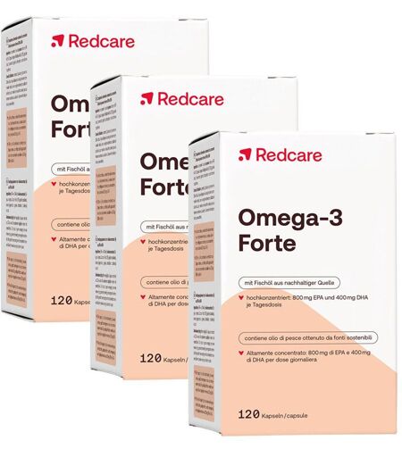 Redcare Omega-3 Forte Kapseln Omega-3-Fettsäuren gehören zu den lebenswichtigen Nährstoffen, die der Körper nicht selbst produzieren kann. Darum müssen sie über die Nahrung aufgenommen werden. Die Redcare Omega-3 Forte Kapseln enthalten die wertvollen Fettsäuren Eicosapentaensäure (EPA) und Docosahexaensäure (DHA). Diese: … leisten einen Beitrag zu einer normalen Herzfunktion1 DHA leistet zusätzlich einen Beitrag zum Erhalt einer normalen Gehirnfunktion und Sehkraft2 1 Die positive Wirkung stellt sich bei einer täglichen Aufnahme von 250 mg DHA und EPA ein2 Die positive Wirkung stellt sich bei einer täglichen Aufnahme von 250 mg DHA In jeder Kapsel steck reines Omega-3 aus Fischöl, das aus nachhaltigem Fischfang gewonnen wird. Das Omega-3 ist zertifiziert durch das Friend of the Sea Projekt und lizensiert von EPAX. EPAX liefert seit Jahren beste, marine Inhaltsstoffe höchster Qualität – und versorgt Sie täglich mit bestem Omega-3. Nehmen Sie zwei Redcare Omega-3- Forte Kapseln täglich mit ausreichend Flüssigkeit zu sich, um die optimale Tagesdosis zu erreichen. Auf die Tageszeit muss nicht geachtet werden. Mit 120 Kapseln pro Dose hält eine Packung Redcare Omega-3 Forte zwei Monate.Pflichtangaben Zutaten:EPA- und DHA-reiches Fischölkonzentrat (Engraulis ringens, Südostpazifik (87)), Gelatine (Rind), Feuchthaltemittel: Glycerin, Antioxidationsmittel: stark tocopherolhaltige ExtrakteVerzehrempfehlung: 2 Kapseln täglich mit ca. 200 ml Wasser einnehmenHinweise: Die empfohlene tägliche Verzehrmenge darf nicht überschritten werden. Für schwangere und stillende Frauen nicht geeignet.Aufbewahrung: Außerhalb der Reichweite von kleinen Kindern aufbewahren. Kühl, trocken und lichtgeschützt lagern. Nettofüllmenge: 3 x 120 Kapseln Herstellerdaten: Shop-Apotheke B.V. Erik de Rodeweg 11/13 5975 WD Sevenum Niederlande ...