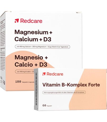 RedCare Vitamin B-Komplex Forte + Redcare Magnesium + Calcium + D3Im Set enthalten: RedCare Vitamin B-Komplex Forte Redcare Magnesium + Calcium + D3Nahrungsergänzungsmittel sind kein Ersatz für eine ausgewogene und abwechslungsreiche Ernährung und eine gesunde LebensweiseRedCare Vitamin B-Komplex ForteDie 8 B-Vitamine erfüllen zahlreiche Funktionen im Körper und sind essenziell. Das bedeutet, dass sie über die Nahrung aufgenommen werden müssen. Nur eine Kapsel RedCare Vitamin B-Komplex Forte täglich versorgt Sie mit allen acht Vitaminen. Dazu zählen:• Thiamin (Vitamin B1) Riboflavin (Vitamin B2) Niacin (Vitamin B3) Pantothensäure (Vitamin B5) Pyridoxin (Vitamin B6) Biotin (Vitamin B7) Folsäure (Vitamin B9) Cobalamin (Vitamin B12)In der Ernährung sind B-Vitamine vor allem in tierischen Produkten wie Fleisch, Eiern oder Milch enthalten, aber auch Hülsenfrüchte und Vollkornprodukte zählen zu Lieferanten der essenziellen B-Vitamine. Da Vitamin B12 ausschließlich in tierischen Produkten vorkommt, sollten vor allem vegan lebende Menschen ihre B12 Versorgung im Blick behalten. Mit RedCare können Sie nun eine ausreichende Versorgung gewährleisten.Da sich hochdosierte B-Vitamine auf den Energiestoffwechsel auswirken und Müdigkeit verringern können, ist eine Einnahme am Morgen empfehlenswert. Nehmen Sie eine Kapsel mit einem großen Glas Wasser vor oder zum Frühstück ein.Redcare Magnesium + Calcium + D3 Knochen und Muskeln stützen Ihren Körper – Tag für Tag. Sie möchten Ihrem Bewegungsapparat etwas Gutes tun? Das Präparat von RedCare enthält eine abgestimmte Kombination aus Calcium, Vitamin D sowie Magnesium. Ein weiterer Vorteil ist, dass Sie keine unnötigen Hilfsstoffe zu sich nehmen. Redcare Magnesium + Calcium + D3 ist dadurch deutlich reiner als vergleichbare Präparate in Tablettenform.Die Kapseln unterstützen Sie jeden Tag ideal mit verschiedenen Mikronährstoffen: Calcium trägt zum Erhalt normaler Knochen und Zähne sowie zur normalen Funktion des Energiestoffwechsels bei. Vitamin D trägt zur normalen Aufnahme von Calcium sowie zum normalen Calciumspiegel im Blut bei. Vitamin D, Calcium und Magnesium tragen zum Erhalt einer normalen Funktion der Muskeln bei. Nehmen Sie täglich zwei bis drei Kapseln mit reichlich Flüssigkeit (zum Beispiel ein großes Glas Wasser) ein. Redcare Magnesium + Calcium + D3 enthält 180 Kapseln – ideal für eine zwei- bis dreimonatige Einnahme.Zutaten: RedCare Vitamin B-Komplex Forte Füllstoff: Mikrokristalline Cellulose, Überzugsmittel: Hydroxypropylmethylcellulose, Calcium-D-pantothenat, Nicotinamid, Pyridoxinhydrochlorid, Thiaminhydrochlorid, Riboflavin, Pteroylmonoglutamin-säure, D-Biotin, CyanocobalaminRedcare Magnesium + Calcium + D3 Calciumcarbonat, Magnesiumoxid, Reismehl, Überzugsmittel: Hydroxypropylmethylcellulose, Trennmittel: Calciumsalze der Speisefettsäuren, CholecalciferolNährwerte: RedCare Vitamin B-Komplex Forte Durchschnittliche Nährwerte 1 Kapsel* NRV** B-Vitamine Thiamin 4,0 mg 364 %... ...