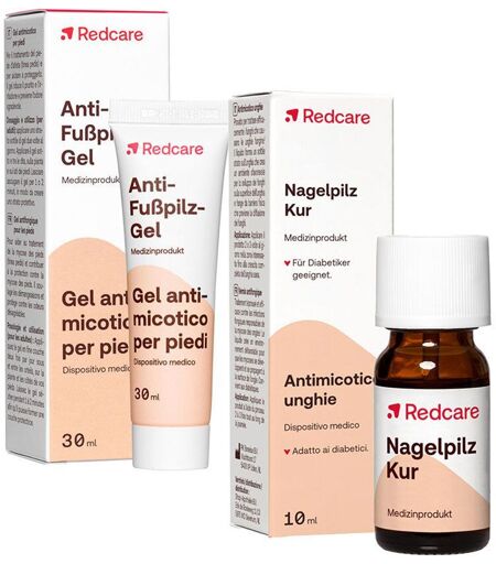 Redcare Nagelpilzkur + Redcare Anti-Fußpilzgel Im Set enthalteen: Redcare Nagelpilzkur Redcare Anti-Fußpilzgel NAGELPILZ KUR Redcare Am Strand, in der Sauna oder in den neuen Sandalen möchten Sie Ihre Nägel nicht verstecken. Sind diese aber von Nagelpilz befallen, passiert meist genau das: Sie fühlen sich unwohl und schränken sich womöglich in Ihrem Alltag ein. Die Nagelpilzkur von RedCare bereitet dem jetzt endlich ein Ende. Zur schnellen Behandlung von Nagelpilz Mit antimykotischem Wirkstoff Beugt Infektion weiterer Nägel vor Die Nagelpilz Kur von RedCare sorgt dafür, dass sie schnell wieder beschwingt durchs Leben gehen können. Sie behandelt den Nagelpilz wirksam und verhindert die Infektion weiterer Nägel. Zusätzlich bildet der Lack eine Schutzschicht, die das Wachstum der Pilze hemmt und so vor einer weiteren Ausbreitung schützt. Die Wirkstoffe des Nagelpilz-Lacks dringen tief in die Nageloberflache ein und bekämpfen den Pilz von innen heraus. Die Anwendung der Nagelpilz Kur von RedCare ist ganz einfach: Der praktische Nagellack lässt sich schnell auftragen und behandelt den Pilz sofort. Tragen Sie den Lack am besten zwei bis dreimal täglich auf den infizierten Nagel auf (die betroffene Fläche muss vorher nicht abgefeilt werden). Wichtig ist, dass die Kur so lange verwendet wird, bis der Nagel komplett herausgewachsen ist. Sonst besteht die Gefahr, dass der Pilz zurückkommt. Bitte beachten Sie, dass das Produkt nur zur äußeren Anwendung und nicht für Kinder und Jugendliche unter 18 Jahren bestimmt ist. Mit der NAGELPILZ KUR RedCare können sich Ihre Füße schnell wieder sehen lassen und dem nächsten Saunabesuch oder Strandurlaub steht Nichts im Wege! Anwendung: Nagelpilz Kur ist zur äußerlichen Anwendung und nicht für Kinder und Jugendliche unter 18 Jahren bestimmt. Tragen Sie das Produkt zwei- oder dreimal über den Tag verteilt auf die betroffene Stelle auf, bis der betroffene Nagel vollständig rausgewachsen ist. Inhaltsstoffe: Aqua, Ethoxydiglycol, ISK1320, Pentylene Glycol, Alcohol Denat., Tridiceth-9, PEG-40, Hydrogenated Castor Oil, Benzyl Alcohol, Limonene, Glycerin, Natilact, Propylene Glycol, PVP, Xanthan Gum, Eucalyptus Globulus Leaf Oil, Lavandula Hybrida Oil, Linalool, Dimethyl Isosorbide, Citrus Aurantium Dulcis Oil, Pogostemon Cablin Oil, Disodium Phosphate, Geraniol, Citral, Biotin, Coumarin, Citric Acid, Farnesol Redcare Anti-Fußpilz-Gel Lindert Hautreizungen & Jucken Verhindert unangenehme Gerüche Frei von Parabenen Wozu dient das Redcare Anti-Fußpilz-Gel? Zu Beginn ist der Fußpilz nicht sichtbar, da die Erreger sehr klein und mit bloßem Auge nicht erkennbar sind. Das typischste Symptom ist Juckreiz zwischen den Zehen oder an der Fußsohle. Auch rote oder schuppende Haut sowie Pusteln oder Bläschen können auftreten. Das Anti-Fußpilz-Gel von Redcare ist ein wirksames Medizinprodukt gegen Fußpilz. Es lindert Juckreiz, Brennen und verhindert unangenehme Gerüche. Das Gel enthält ausschließlich natürliche und... ...