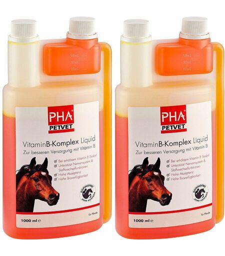 PHA Vitamin B-Komplex Liquid Ergänzungsfuttermittel. PHA VitaminB-Komplex Liquid zur Unterstützung des Nervensystems oder bei erhöhtem Vitamin B Bedarf. PHA VitaminB-Komplex Liquid kann als unterstützende Maßnahme bei Mangelzuständen wie auch bei erhöhtem Vitamin B-Bedarf (z.B. bei Stress oder in der Wachstumsphase) als Kombinationspräparat eingesetzt werden. Es unterstützt dabei das Nervensystem und die Stoffwechselfunktionen. Es beugt Appetitlosigkeit und Gewichtsabnahme vor und unterstützt die Bildung von roten Blutkörperchen. Bei erhöhtem Vitamin B Bedarf Unterstützt Nervensystem & Stoffwechselfunktionen Hohe Bioverfügbarkeit ADMR-konform: Im Wettkampf erlaubt Zusammensetzung: 1.2-Propandiol, Natriumchlorid Zusatzstoffe: Vitamin B1 (3a820) 3.000 mg; Vitamin B2 (3a826) 1.000 mg; Vitamin B6 (3a831) 3.000 mg; Vitamin B12 als Cyanocobalamin 30.000 mcg; Niacinamid (3a315) 6.000 mg; Calcium-D-Pantothenat (3a841) 3.270 mg Technologische Zusatzstoffe: Natriumpropionat (E281), Kaliumsorbat (E202), Zitronensäure (E330) Anwendung: VitaminB-Komplex Liquid kann über das Kraftfutter verabreicht werden. Empfohlene Menge: Fohlen, Jährlingen und Zweijährigen sollten 5-10 ml pro Tag,Großpferden 20-30 ml pro Tag und Sportpferden 30 ml pro Tag über einen Zeitraum von 2-3 Wochen zugefüttert werden.Vor dem Gebrauch gut schütteln. ...