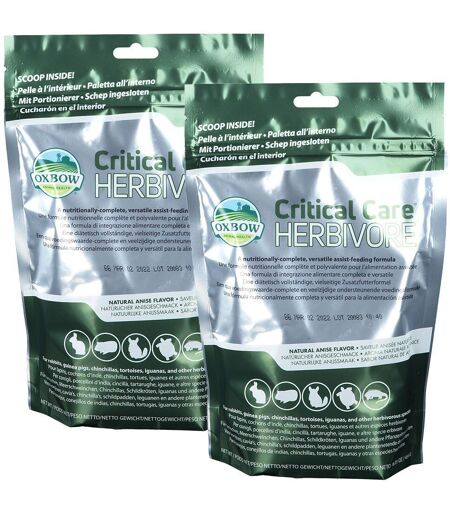 Critical Care von Albrecht bei Appetit- oder Nährstoffmangel von Meerschweinchen, Kaninchen und ChinchillaCritical Care empfiehlt sich besonders bei Appetitmangel oder bei schlechtem Ernährungszustand.Critical Care Alleinfuttermittel für pflanzenfressende Heimtiere Für pflanzenfressende Heimtiere. Die vorübergehende Fütterung von Critical Care empfiehlt sich besonders bei Appetitmangel oder bei schlechtem Ernährungszustand.Dieses Spezialfutter enthält faserreiche Pflanzenbestandteile sowie essenzielle Nährstoffe zur Sicherstellung einer physiologischen Verdauung. Das schmackhafte Critical Care fordert die physiologische Verdauung bei kleinen Pflanzenfressern.Es enthält alle lebensnotwendige Nährstoffe für Meerschweinchen, Chinchillas, Kaninchen, Reptilien und Vögel. Es wird unterstützend gegeben bei geschwächten, oder in der Rekonvaleszenz befindlichen Heimtieren.Ideal zur Ergänzung der Futterration von Terrarientieren.Zusammensetzung:Timothee-Gras, Sojabohnenschalen, Sojabohnenmehl, Weizenkeime, Melasse, Kochsalz, Kalziumkarbonat, natürliches Aroma, Haferschalkleie, Weizenfuttermehl, Hefe, Magnesium-Sulfat.Analytische Bestandteile pro kg:Ernährungsphysiologische Analytische Bestandteile: E672 (Vitamin A) 19.000 I.E., E671 (Vitamin D3) 900 I.E., Vitamin E 190 I.E., Vitamin C 10.000 mg, E1 (Eisen) 50 mg, E2 (Iod) 0,50 mg, E3 (Kobalt) 2 mg, E4 (Kupfer) 12 mg, E5 (Mangan) 10 mg, E6 (Zink) 100 mg, E8 (Selen) 0,22 mg, 3b8.10 (inaktivierte Selenhefe) 0,08 mg.Analytische Bestandteile und Gehalte: Rohprotein 16,00 %, Rohfett 3,00 %, Rohfaser 23,50 %, Rohasche 10,00 %, Calcium 0,50 %, Phosphor 0,30 %.Fütterungsempfehlung: Beutel vor Zubereitung gut schütteln.Falls tierärztlich nicht anders empfohlen, erhalten etwa Pflanzenfressende Säuger:3 Esslöffel Schrot* pro kg Körpergewicht täglich.Pflanzenfressende Reptilien: 1 Esslöffel Schrot* pro kg Körpergewicht täglich.Mischen Sie zu jeder Mahlzeit 1 Volumenteil Schrot mit etwa 2 Volumenteilen warmem Wasser bis einfütterungsfertiger Brei in der gewünschten Konsistenz entsteht.Die empfohlene Tagesmenge wird auf 4 bis 6 Fütterungen pro Tag aufgeteilt .*1 Esslöffel entspricht ca. 9 g Schrot.Lagerung: Kühl und trocken. Mit Wasser zubereitet bis 24 Stunden im Kühlschrank. ...