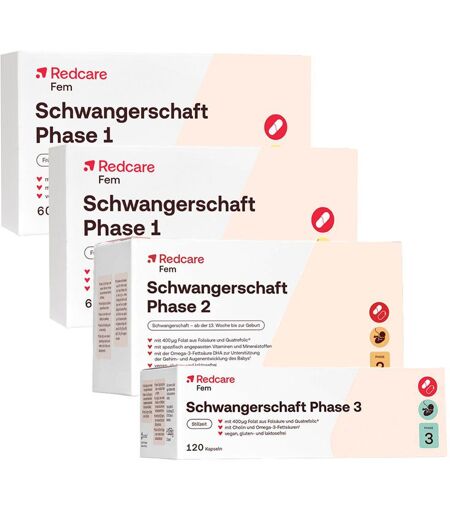Im Set enthalten: 2 x Redcare Schwangerschaft Phase 1 1 x Redcare Schwangerschaft Phase 2 1 x Redcare Schwangerschaft Phase 3 Redcare Schwangerschaft Phase 1 Wenn sich Nachwuchs ankündigt, beginnt eine spannende Reise. Sie möchten sich und Ihr Baby schon zu Beginn der Schwangerschaft mit wichtigen Nährstoffen unterstützen? Redcare Schwangerschaft Phase 1 ist der ideale Support für das erste Trimester. Neben wichtigen Vitaminen und Mineralien enthalten die Kapseln auch Cholin. Außerdem liefern sie Folat in Form des lizensierten Inhaltsstoff Quatrefolic® – eine aktive Form von Folat, das besonders gut vom Körper aufgenommen werden kann. Folat trägt zum Wachstum des mütterlichen Gewebes während der Schwangerschaft und zu einer normalen Blutbildung bei. Da ein zu niedriger Folatspiegel bei Schwangeren ein Risikofaktor für die Entstehung von Neuralrohrdefekten beim heranwachsenden Fötus darstellen kann, ist eine ergänzende Einnahme bei bestehendem Kinderwunsch empfehlenswert. Die positive Wirkung stellt sich bei 400 µg täglich ein. Die Deutsche Gesellschaft für Ernährung empfiehlt die Einnahme eines Folsäurepräparats mindestens einen Monat vor und bis zu drei Monaten nach der Empfängnis. Neben Folsäure enthalten die Kapseln alle B-Vitamine, Vitamin C, D, E und K sowie Calcium, Eisen, Selen, Jod und Cholin: Folat, Vitamin D und Vitamin B12 haben eine Funktion bei der Zellteilung. Vitamin B12 und Vitamin B6 tragen zu einer normalen Bildung roter Blutkörperchen bei. Jod, Vitamin B2 und Vitamin B12 tragen zu einer normalen Funktion des Nervensystems bei. Jod trägt zur einer normalen Schilddrüsenfunktion bei. So sind Sie in den ersten 12 Wochen ihrer Schwangerschaft bestens versorgt. Nehmen Sie eine Kapsel täglich mit 200 Milliliter Flüssigkeit ein – am besten zu einer Mahlzeit. Jede Packung enthält 60 Kapseln und reicht zwei Monate. Pflichtangaben Zutaten: Cholintartrate, Calciumoxid, L-Ascobinsäure, mittelkettige Fettsäuren-Pulver aus Kokos Eisenfumarat; Nicotinamid, D-α- Tocopherylacetat, Cholecalciferol, Calcium-D-pantothenat Trennmittel: Siliciumdioxid, Natriumselenit, Menachion-7 (MK-7), Pyridoxinhydrochlorid, Thiaminmononitrat, Kaliumiodid, Riboflavin, (6S)-5-Methyltetrahydrofolsäure, Glucosaminsalz, Cyanocobalamin, Pteroylmonoglutaminsäure, D-Biotin Nährwerte: Durchschnittliche Nährwerte: 1 Kapsel2 NRV3 Thiamin 1,4 mg 127 % Riboflavin 1,4 mg 100 % Vitamin B6 1,9 mg 136 % Vitamin B12 4,5 µg 180 % Biotin 40 µg 80 % Niacin 12 mg 75 % Pantothensäure 6 mg 100 % Folate4 davon Folsäure davon (6S)-5-Methyltetrahydrofolsäure 800 µg 400 µg 400 µg 400 % - - Vitamin E 4,8 mg 40 % Vitamin D 20 µg 400 % Vitamin K 35 µg 47 % Vitamin C 55 mg 69 % Calcium 150 mg 19 % Jod 150 µg 100 % Selen 26 µg 47 % Eisen 10 mg 71 % Cholin 130 mg ² angegebene tägliche Verzehrmenge ³Anteil an der Nährstoffreferenzmenge ⁴Folat aus 400 μg (6S)-5-Methyltetrahydrofolsäure, Glucosaminsalz (Quatrefolic®) und 400 μg Pteroylmonoglutaminsäure Anwendung: Täglich 1 Kapsel... ...