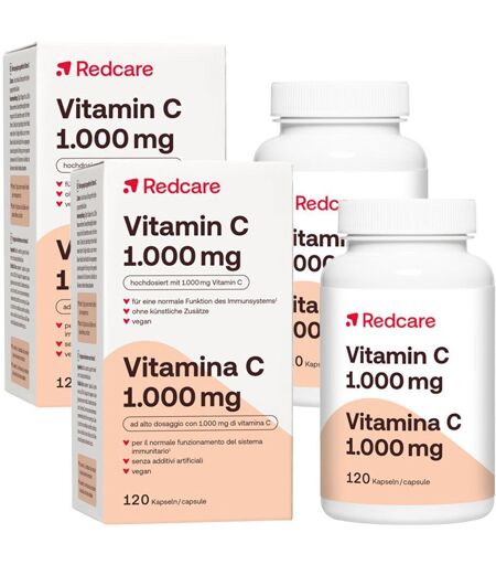 Redcare Vitamin C hochdosiert Redcare Vitamin C 1.000 mg – das Plus an Vitamin C. Vitamin C ist einer Allroundtalent in unserem Körper und an zahlreichen Stoffwechselvorgängen beteiligt. Am bekanntesten ist es für seine Rolle im Immunsystem, doch Vitamin C hat noch viele weitere essenzielle Aufgaben: Vitamin C trägt zu einer normalen Funktion des Immunsystems bei. Vitamin C trägt dazu bei, die Zellen vor oxidativem Stress zu schützen. Vitamin C trägt zu einer normalen Kollagenbildung für eine normale Funktion der Haut bei. Für eine optimale Funktion ist es wichtig, genügend Vitamin C durch eine ausgewogene Ernährung aufzunehmen. Wenn Sie zusätzliches Vitamin C zu sich nehmen möchten, sind die Vitamin-C-Kapseln von Redcare ideal. Sie sind hochdosiert und einfach einzunehmen – eine Kapsel enthält 1.000 Milligramm Vitamin C. Nehmen Sie täglich eine Kapsel mit einem großen Glas Wasser, vorzugsweise nicht zusammen mit Vitamin-C-haltigen Lebensmitteln, wie z.B. rote Paprika, schwarze Johannisbeeren oder Zitrusfrüchte. Eine Packung enthält 120 Kapseln und reicht für vier Monate. Pflichtangaben Zutaten: L-Ascorbinsäure, Überzugsmittel: Hydroxypropylmethylcellulose Nährwerte: Nährstoffe 1 Kapsel 1 NRV 2 Vitamin C 1.000 mg 1.250% 1angegebene tägliche Verzehrmenge 2Anteil an der Nährstoffreferenzmenge Verzehrempfehlung: Täglich eine Kapsel mit ca. 200 ml Wasser einnehmen Hinweis: Die empfohlene tägliche Verzehrmenge darf nicht überschritten werden. Dieses Produkt ist kein Ersatz für eine ausgewogene, abwechslungsreiche Ernährung und eine gesunde Lebensweise. Sehr hoher Vitamin C-Gehalt, nicht gleichzeitig mit weiteren Vitamin C-haltigen Produkten einnehmen. Aufbewahrung: Außerhalb der Reichweite von kleinen Kindern aufbewahren. Kühl, trocken und dunkel lagern. Nettofüllmenge: 2 x 120 Kapseln Herstellerdaten: Shop-Apotheke B.V. Erik de Rodeweg 11/13, 5975 WD Sevenum Niederlande ...