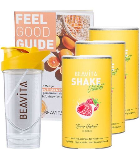 Compris dans le set: BEAVITA shaker Guide BEAVITA Feel Good 3 x shake diététique BEAVITA Vitalkost, yogourt à la framboiseBEAVITA ShakerQue ce soit pour votre shake de substitut de repas BEAVITA ou pour vos boissons protéinées, le shaker robuste BEAVITA est le compagnon idéal : Exclusif Compatible avec le lave-vaisselle Sans BPA Avec passoire amovible Sans plastifiantPortez le shaker intelligent partout avec vous et nettoyez-le ensuite sans problème dans le lave-vaisselle. Grâce au tamis intégré, les shakes sont particulièrement crémeux - vous pouvez également retirer le tamis pour un nettoyage encore plus facile. Comment préparer votre substitut de repas BEAVITA avec le shaker : pour une portion, mélangez environ quatre cuillères à soupe bien remplies avec 300 millilitres d'eau. Vous avez plutôt envie de smoothies, de boissons non alcoolisées ou simplement d'eau ? Là aussi, le récipient est super adapté.Indications obligatoires Matériau : Plastique titaneRemarques : Le shaker peut être mis au lave-vaisselleRemplissage net : 700 ml Données du fabricant: nu3 GmbH Brückenstr. 5 10179 Berlin AllemagneBEAVITA Feel Good GuideTu veux perdre du poids ou maintenir ton poids après un régime, mais tu ne sais pas comment faire ? Entrer à nouveau dans ton pantalon préféré serait un rêve ? Alors, procure-toi notre coach minceur BEAVITA ! Le livret t'offre le soutien idéal pour ton régime BEAVITA: Plan de régime de 14 jours avec BEAVITA Connaissances de base sur le thème de l'amaigrissement Conseils pour une perte de poids idéale et pour maintenir son poids à long terme Des idées de recettes géniales pour des plats pauvres en caloriesTon compagnon idéal pour atteindre le poids souhaitéLe coach minceur BEAVITA est ton compagnon idéal pour le régime BEAVITA. Outre des informations générales et utiles, le guide te fournit un grand choix de délicieuses recettes pour des plats pauvres en calories. Tu y trouveras également de précieux conseils sur la manière de maintenir ton poids idéal nouvellement acquis. Surmonte tes démons intérieurs et commence dès maintenant avec BEAVITA!A propos : Le journal inclus t'offre suffisamment de place pour noter tes succès!Langue: Français. Veuillez adopter une alimentation variée et équilibrée et un mode de vie sainBEAVITA Shake diététique, yaourt à la framboise Vous souhaitez vous sentir à nouveau bien dans votre corps et profiter de la vie ? Alors BEAVITA est fait pour vous : Seulement 206 kcal par shake 23 vitamines & minéraux Rapide & facile à préparerAvec le shake BEAVITA, vous pouvez atteindre votre poids idéal. Le shake amaigrissant est merveilleusement crémeux, agréablement sucré grâce à un peu de miel et a un goût fruité de framboise. Grâce à sa préparation simple, il vous apporte en très peu de temps 13 vitamines et dix minéraux. Ceux-ci ont différentes fonctions dans le corps : par exemple, le fer contribue au métabolisme énergétique normal et le zinc soutient le métabolisme des acides gras et des glucides.... ...