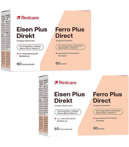 Nahrungsergänzungsmittel sind kein Ersatz für eine ausgewogene und abwechslungsreiche Ernährung und eine gesunde Lebensweise.Redcare Eisen Plus Direkt Redcare Eisen Plus Direkt – Ihr täglicher Begleiter für eine optimale Eisenversorgung. Mit fruchtigem Himbeergeschmack und der innovativen 4-in-1-Formel, die Vitamin B12, Vitamin C, Folsäure und 14 Milligramm Eisen kombiniert, unterstützt es optimal die Blutbildung: Eisen trägt zur normalen Bildung von roten Blutkörperchen und Hämoglobin bei. Vitamin C erhöht die Eisenaufnahme. Eisen, Folat, Vitamin C tragen zur Verringerung von Müdigkeit und Ermüdung bei. Eisen, Folat haben eine Funktion bei der Zellteilung. Die Einnahme der Redcare Eisen Plus Direkt Sticks ist leicht: Täglich den Inhalt eines Sticks direkt auf die Zunge geben und zergehen lassen – perfekt für unterwegs. Mit einem Portionsbeutel werden 100 Prozent des Tagesbedarfs an Eisen gedeckt. Die Packung enthält 60 Portionsbeutel und reicht für zwei Monate.PflichtangabenZutaten: Süßungsmittel: Sorbit, Acerolasaftpulver (Malpighia glabra), Eisenfumarat, Säuerungsmittel: Citronensäure, Rote Beete Pulver (Beta vulgaris), natürliches Himbeer-Aroma, Süßungsmittel: Sucralose, Pteroylmonoglutaminsäure, CyanocobalaminNährwerte: Nährstoffe: 1 Portionsbeutel* NRV** Eisen 14 mg 100 % Folsäure 300 µg 150 % Vitamin B12 3,0 μg 120 % Vitamin C 80 mg 100 % * angegebene tägliche Verzehrmenge** Anteil an der NährstoffreferenzmengeVerzehrempfehlung:Täglich den Inhalt eines Sticks direkt auf die Zunge geben und zergehen lassen.Hinweise: - Die angegebene empfohlene Tagesmenge darf nicht überschritten werden. - Dieses Produkt ist kein Ersatz für eine ausgewogene, abwechslungsreiche Ernährung und eine gesunde Lebensweise. Aufbewahrung: - Kühl, trocken und dunkel lagern. - Außerhalb der Reichweite von kleinen Kindern aufbewahren.Nettofüllmenge: 60 Portionsbeutel a 1,2 g = 73 gHersteller: Shop-Apotheke B.V. Erik de Rodeweg 11/13 5975 WD Sevenum Niederlande ...