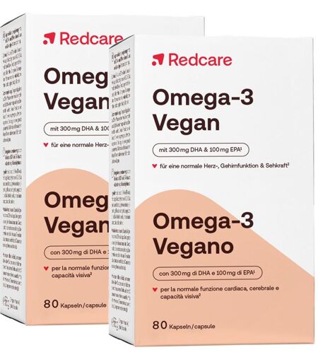 Nahrungsergänzungsmittel sind kein Ersatz für eine ausgewogene und abwechslungsreiche Ernährung und eine gesunde Lebensweise.Redcare Omega-3 vegan Omega-3-Fettsäuren gehören zu den mehrfach ungesättigten Fettsäuren, die essenziell für den Körper sind, da dieser sie nicht eigenständig produzieren kann. Sie sind bekannt für ihre Effekte auf die Gesundheit, insbesondere in Bezug auf Herz, Gehirn und Augen. Eine ausreichende Zufuhr von Omega-3 ist daher unerlässlich, um diese wichtigen Funktionen zu unterstützen. Die Redcare Omega-3 Vegan Kapseln bieten eine pflanzliche Alternative, die wertvolle Fettsäuren wie Eicosapentaensäure (EPA) und Docosahexaensäure (DHA) enthält. DHA und EPA leisten einen Beitrag zu einer normalen Herzfunktion. Die positive Wirkung stellt sich bei einer täglichen Aufnahme von 250 mg DHA und EPA ein. DHA leistet zusätzlich einen Beitrag zum Erhalt einer normalen Gehirnfunktion und Sehkraft. Die positive Wirkung stellt sich bei einer täglichen Aufnahme von 250 mg DHA Jede Kapsel beinhaltet hochwertiges veganes Omega-3 aus der Mikroalge Schizochytrium sp.. In zwei Kapseln stecken insgesamt 500 Milligramm Omega-3-Fettsäuren, davon 300 Milligramm DHA und 100 Milligramm EPA – so sind Sie optimal mit Omega-3 versorgt. Für die ideale Tagesdosis nehmen Sie täglich zwei Redcare Omega-3 Vegan Kapseln mit ausreichend Flüssigkeit ein, wahlweise morgens, mittags oder abends. Mit 80 Kapseln pro Packung sind Sie für 40 Tage bestens versorgt.Pflichtangaben Zutaten: DHA- und EPA-reiches Öl aus der Mikroalge Schizochytrium sp. (USA, 68 %), modifizierte Stärke, Festigungsmittel: Glycerin, Geliermittel: Carrageen, Säureregulator: Natriumphosphate, Antioxidationsmittel: stark tocopherolhaltige Extrakte Nährwerte: Nährstoffe 2 Kapseln 1* Algenöl davon Omega-3 Fettsäuren davon DHA davon EPA 1.000 mg 500 mg 300 mg 100 mg *angegebene tägliche VerzehrmengeVerzehrempfehlung: 2 Kapseln täglich mit ca. 200 ml Wasser einnehmenHinweis: Die empfohlene tägliche Verzehrmenge darf nicht überschritten werden. Dieses Produkt ist kein Ersatz für eine ausgewogene, abwechslungsreiche Ernährung und eine gesunde Lebensweise.Aufbewahrung:Außerhalb der Reichweite von kleinen Kindern aufbewahren. Kühl, trocken und dunkel lagern.Nettofüllmenge: 56 g (80 Kapseln) Herstellerdaten: Shop-Apotheke B.V. Erik de Rodeweg 11/13, 5975 WD SevenumNiederlande ...