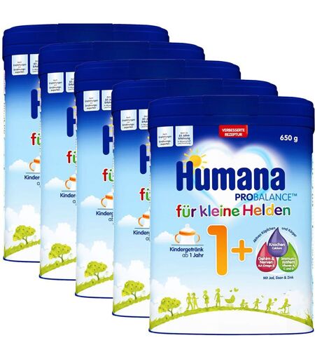 Muttermilch ist die ideale Nahrung für Säuglinge in den ersten Monaten. Sie ist gut verdaulich und so zusammengesetzt, dass sie im ersten Lebenshalbjahr den Bedarf an Nährstoffen und Flüssigkeit deckt. Bei alternativer Ernährung mit Muttermilchersatzprodukten beachten Sie die Hinweise und Zubereitungsanleitungen auf den Packungen genau, denn eine unsachgemäße Zubereitung von Säuglingsanfangsnahrung kann zu gesundheitlichen Beeinträchtigungen führen. Bitte achten Sie auf eine ausgewogene und abwechslungsreiche Ernährung und eine gesunde Lebensweise. Wir empfehlen, sich vor Anwendung von Muttermilchersatznahrung ärztlich beraten zu lassen. Humana PROBALANCE™ für kleine Helden 1+ Enthält ALA (essentielle Omega-3-Fettsäure) Fördert das Immunsystem durch Vitamin D Enthaltenes Calcium ist wichtig für die normale Entwicklung der Knochen Vitamin D trägt zur normalen Entwicklung von Knochen bei Das Humana Kindergetränk 1+ für Kinder ab 1 Jahr versorgt Ihr Kind mit wichtigen Nährstoffen. Es ist sehr gut geeignet für die Umstellung der Ernährungsbedürfnisse, die bei Kindern ab 1 Jahr stattfindet. Zutaten: Milchgetränkepulver zur besonderen Ernährung von Kleinkindern mit Magermilch und pflanzlichen Ölen Entrahmte MILCH, LAKTOSE, pflanzliche Öle (Palme, Raps, Sonnenblume), Palmkernfett, Entsalztes MOLKENPULVER, Vitamin C, Eisenbisglycinat, Vitamin A, Zinksulfat, Calciumcarbonat, Kaliumiodat, Vitamin B12, Folsäure, Vitamin D. Enthält Milch und Milchderivate Nährwertangaben: Durchschnittliche Nährwertangaben pro 100 ml des verzehrfertigen Erzeugnisses Brennwert 55 kcal / 230 kJ Fett 3,1 g davon gesättigte Fettsäuren 1,2 g davon einfach ungesättigte Fettsäuren 1,3 g davon mehrfach ungesättigte Fettsäuren 0,7 g Kohlenhydrate 5,3 g davon Zucker 5,3 g Ballaststoffe < 0,1 g Eiweiß 1,4 g Salz Äquivalent 0,04 g Calcium 126 mg Eisen 1,4 mg Folsäure 21 µg Jod 18,4 µg Vitamin A 75,6 µg Vitamin B 12 0,26 µg Vitamin C 7,9 mg Vitamin D 1,7 µg Zink 0,84 mg Alpha-Linolensäure 52,5 mg Laktose 5,3 g Natrium 0 mg Verzehrempfehlung: Baby ist nun 1 Jahr alt und entdeckt die Welt jeden Tag aufs Neue. Auch die Ernährungsbedürfnisse ändern sich. Unser Kindergetränkfür kleine Helden unterstützt die altersgerechte kognitive und motorische Entwicklung und versorgt Ihr Kind dabei mit allenwichtigen Nährstoffen. Hinweise: Die empfohlene tägliche Verzehrsmenge darf nicht überschritten werden. Aufbewahrung: Kühl (6-25 °C) und lichtgeschützt lagern. Außerhalb der Reichweite von Kindern aufbewahren. Nettofüllmenge: 650 g Hersteller: Humana Vertriebs GmbH Postfach 286129 28361 Bremen ...