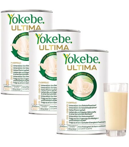 Bitte achten Sie auf eine ausgewogene und abwechslungsreiche Ernährung und eine gesunde Lebensweise.Set enthält3x Yokebe® ULTIMA Fat Burning Shake 400 gNahrungsergnzungsmittel sind kein Ersatz für eine ausgewogene und abwechslungsreiche Ernährung und eine gesunde Lebensweise.Yokebe® ULTIMA Fat Burning Shake Natürlich lecker abnehmen und Fett verbrennenDer neue Yokebe Ultima Fat Burning Shake ist ein Mahlzeitersatz-Shake zur Unterstützung der Gewichtsabnahme mit Vanille-Zitronen-Geschmack. Yokebe Ultima enthält als einziges der Yokebe Mahlzeitersatzprodukte einen Guaranasamenextrakt, welcher den Fettstoffwechsel zusätzlich unterstützt. Es ersetzt die Mahlzeiten und verbrennt dabei effektiv Fett. Wirksamkeit klinisch bestätigt.Wichtige NährstoffeDie speziell abgestimmte Kombination aus hochwertigen Proteinen, essentiellen Vitaminen, Mineralstoffen und Spurenelementen liefert die wichtigsten Nährstoffe in einer kompletten Mahlzeit. Yokebe Ultima unterstützt das Immunsystem und trägt zur Verringerung von Müdigkeit & Erschöpfung sowie zu einem normalen Energiestoffwechsel bei.Zutaten:Sojaproteinisolat, Fruktose, Inulin, Dextrose, Emulgator Sojalecithin, Maltodextrin, Zucker, Kaliumcitrat, Aroma, pulverisierte pflanzliche Zubereitung (Grapefruitextrakt 0,28 %, Guaranasamenextrakt 0,23 %, Koffein, Hesperidin aus Citrus 0,08 %, Blutorangensaftkonzentrat 0,04 %), Magnesiumhydroxid, Rapsöl, Süßungsmittel Steviolglykoside, Calciumcarbonat, Trennmittel Siliciumdioxid, Kolanussextrakt 0,03 %, L-Ascorbinsäure, Eisensulfat, Zinkoxid, D-α-Tocopherylacetat, Nicotinamid, Mangansulfat, Antioxidationsmittel DL-α-Tocopherol, Sojaöl, Calcium-D-Pantothenat, Farbstoff Beta-Carotin, Riboflavin, Pyridoxinhydrochlorid, Thiaminmononitrat, Retinylacetat, Chrompicolinat, Pteroylmonoglutaminsäure, Kupfergluconat, Phylloquinon, Natriumselenit, D-Biotin, Cholecalciferol, Cyanocobalamin.Nährwertangaben:Verzehrempfehlung:Als Ersatz für eine Mahlzeit (1 Portion) werden 4 Messlöffel (40 g) Yokebe Ultima in 200 ml fettarme, laktosefreie Milch (1,5 % Fett) eingerührt. Bitte geben Sie immer zuerst die Milch in das Glas oder den Shaker und dann das Pulver. Die Mischung gut umrühren oder schütteln.Hinweis: Achten Sie auf eine ausreichende Flüssigkeitsaufnahme (2 -3 Liter pro Tag) Bei Langzeitanwendung wird eine ärztliche Beratung empfohlen. Personen mit Lebensmittelallergien sollten ärztlichen Rat einholen. Kann Spuren von Hühnerei-Eiweiß enthalten. Die Aktivkost Yokebe Classic ist glutenfrei. Bitte beachten Sie, dass die Yokebe-Diät nur im Rahmen einer kalorienreduzierten Ernährung den gewünschten Erfolg erzielen kann. Andere Lebensmittel müssen Teil dieser Ernährung sein. Um die genannten Effekte zu erzielen ist es erforderlich, Yokebe Classic gemäß dem Zubereitungshinweis im Rahmen der Diätpläne zu verzehren. Eine abwechslungsreiche und ausgewogene Ernährung sowie eine gesunde Lebensweise sind Grundvoraussetzung für eine gute Gesundheit. Gewichtsabnahme mit Yokebe: Das Ersetzen... ...