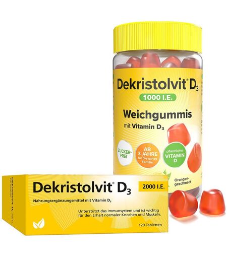 Im Set enthalten: Dekristolvit D3 2000 I.E. Dekristolvit® D3 1000 I.E. Weichgummis Nahrungsergänzungsmittel sind kein Ersatz für eine abwechslungsreiche und ausgewogene Ernährung und eine gesunde Lebensweise. Dekristolvit D3 2000 I.E. Vitamin D-Unterversorgung vermeiden mit Dekristolvit® D3 2.000 I.E. Tabletten Vitamin D hat Einfluss auf zahlreiche Abläufe im Körper: Das Vitamin mit Schlüsselfunktion wirkt regulierend auf das Immunsystem, sorgt für starke Knochen und gesunde Zähne, unterstützt die Muskelarbeit und ist beteiligt an der Zellteilung. Ein Großteil der Deutschen jedoch ist nicht ausreichend mit Vitamin D versorgt, die Unterversorgung erstreckt sich über alle Altersklassen. Dekristolvit® D3 2000 I.E. Tabletten unterstützen wirksam das Immunsystem, Knochen und Muskulatur. Durch Vitamin D wird die Aufnahme von Calcium, das für viele Körperfunktionen benötigt wird, deutlich verbessert. Frei von Gluten, Laktose, Fructose und Gelatine sind sie sehr gut verträglich. Dekristolvit® D3 2.000 I.E. Tabletten – für ausreichend Vitamin D im Blut Dosierung ab 1 Tablette täglich für eine ausreichende Versorgung Für Kinder ab 11 Jahren, Jugendliche und Erwachsene In Deutschland hergestellt und entwickelt Hinweise auf eine Unterversorgung mit Vitamin D Mögliche Anzeichen einer Unterversorgung können Muskelkrämpfe und -schmerzen sowie eine höhere Infektanfälligkeit sein. Dekristolvit® D3 2.000 I.E. Tabletten können helfen, den täglichen Bedarf an Vitamin D zu decken. Immunsystem Vitamin D ist eng mit der Regulation unseres Immunsystems verbunden: Es hemmt zum einen Entzündungsreaktionen, die infolge von zellulärem Stress entstehen. Zum anderen fördert Vitamin D spezielle Immunzellen, die Reparaturprozesse unterstützen. Mit Dekristolvit® D3 2.000 I.E. Tabletten können Sie Ihr Immunsystem wirksam unterstützen. Knochen Für gesunde Knochen ist Vitamin D von zentraler Bedeutung: Vitamin D trägt dazu bei, dass Calcium aus der Nahrung gut aufgenommen und in den Knochen eingebaut werden kann. Durch die Aufnahme von Vitamin D wird der Knochenaufbau unterstützt. Muskulatur Vitamin D begünstigt den Calciumeinstrom in die Muskelfaser und fördert durch Bindung an intrazelluläre Rezeptoren in der Muskulatur die Proteinsynthese zur Bildung von Muskelfasern. Auf diese Weise wird die Muskelarbeit unterstützt. Zutaten: Lactose, Füllstoff Cellulose, Maisstärke, modifizierte Stärke, Trennmittel: Magnesiumsalze der Speisefettsäuren, Siliciumdioxid; Cholecalciferol. Zusammensetzung pro Tablette RM (%)* pro 2 Tabletten RM (%)* Vitamin D3 50 µg (= 2000 I.E.) 1000 100 μg (= 4000 I.E.) 2000 *RM = Referenzmenge für die tägliche Zufuhr gemäß Lebensmittelinformationsverordnung Für die Angabe von Vitamin D-Dosierungen wird manchmal die Einheit I.E.“, also Internationale Einheiten, und manchmal die Einheit μg“, also Mikrogramm verwendet. Die Umrechnung ist wie folgt: 1 μg = 40 I.E.; 1 I.E. = 0,025 μg Verzehrempfehlung: Erwachsene und Kinder ab 11 Jahren können täglich bis zu 2... ...