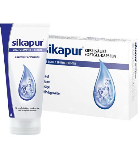 Im Set enthalten:sikapur® Kieselsäure Softgel-Kapseln (90 Stück) sikapur® Vital Shampoo + Biotin (200 ml)Nahrungsergänzungsmittel sind kein Ersatz für eine ausgewogene und abwechslungsreiche Ernährung und eine gesunde Lebensweise. sikapur® Kieselsäure Softgel-Kapseln Zutaten: Sonnenblumenöl, Kieselsäure, Gelatine, Feuchthaltemittel: Glycerin, Sorbit; Wasser, Zinkgluconat, Mangangluconat, Farbstoff , Antioxidationsmittel Alpha-Tocopherol, Natriumselenat, Biotin.Nährwerte: Zusammensetzung pro Kapsel Brennwert 30 kj / 7 kcal Fett 0,6 g dav. ges. Fettsäuren < 0,1 g Kohlenhydrate < 0,3 g dav. Zucker < 0,01 g Eiweiß 0,3 g Salz < 0,01 g Biotin 37,5 µg Zink 5 mg Mangan 2 mg Selen 55 µg Kieselsäure 420 mg dav. Silicium 196 mg Verzehrempfehlung: 1 Kapsel am Tag mit einem Glas Wasser zwischen den Mahlzeiten verzehren. Hinweis:Die angegebene empfohlene tägliche Verzehrmenge darf nicht überschritten werden.Aufbewahrung: Kühl (6-25 °C) und lichtgeschützt lagern. Außerhalb der Reichweite von Kindern aufbewahren.Nettofüllmenge 90 Kapseln = 138 g + 200 ml Herstellerdaten: Hübner Naturarzneimittel GmbH Lil-Dagover-Ring 7 82031 Grünwald sikapur® Vital Shampoo + BiotinDie Haarwurzeln erhalten durch das Zusammenspiel von Kieselsäure, Biotin und Weizenproteinen die optimale Versorgung an Nährstoffen für gesundes und schönes Haar. sikapur® VITAL SHAMPOO + BIOTIN ist pH-hautneutral und ermöglicht eine feuchtigkeitsspendende Pflege für Haare und Kopfhaut. Tiefgreifende Pflege bis in die Haarwurzeln – mit Kieselsäure, Biotin und Weizenproteinen Stärkt das Haar und verleiht lebendiges Volumen Für dünnes, trockenes und normales Haar Auch für empfindliche Kopfhaut geeignet Frei von Parabenen und Silikon Vegan Hergestellt in DeutschlandAnwendung:Sanft ins feuchte Haar einmassieren, kurz einwirken lassen und danach sorgfältig ausspülen. sikapur® VITAL SHAMPOO + BIOTIN eignet sich für die tägliche Haarwäsche. Der Kontakt mit den Augen sollte vermieden werden.Zusammensetzung:Aqua, Disodium Laureth Sulfosuccinate, Cocamidopropyl Betaine, Disodium Cocoamphodiacetate, Lauryl Glucoside, Hydrated Silica, Glyceryl Laurate, Glycol Distearate, Biotin, Cymbopogon Winterianus Herb Oil, Cinnamomum Camphora Linalooliferum Leaf Oil, Citrus Aurantium Dulcis Peel Oil Expressed, Citrus Limon Peel Oil, Cymbopogon Martini Oil, Citrus Reticulata Peel Oil, Hydrolyzed Wheat Protein, Sodium Chloride, Lactic Acid, Parfum, Guar Hydroxypropyltrimonium Chloride, Citronellol, D-Limonene, Potassium Sorbate, Linalool, Geraniol, Sodium Benzoate, Citral, Coumarin, Tin Oxide, Mica, Cl 77891, Xanthan Gum ...