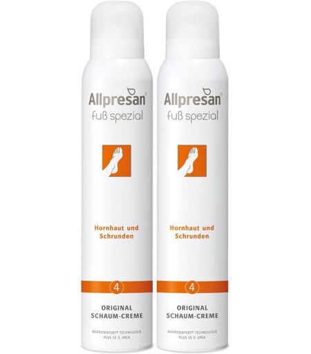 Allpresan Fuß spezial Nr. 4 Schaum-CremeDie Allpresan Fuß spezial Nr. 4 Schaum-Creme mit 15 % Urea reduziert effektiv Hornhaut, Risse und Schrunden und ist speziell für trockene, verhornte und rissige Haut zur Anwendung am Fuß entwickelt worden. Diese intensive Pflegeformel enthält 15 % Urea und Milchsäure, die wirksam Hornhaut, Risse und Schrunden reduzieren und ihrer Neubildung entgegenwirken. Glycerin und biomimetische Lipide erhöhen zudem den Feuchtigkeitsgehalt der Haut und tragen zur Regeneration der Hautbarriere bei. Die leichte Schaumtextur zieht schnell ein, ohne ein fettiges Gefühl zu hinterlassen, und hinterlässt die Haut weich und geschmeidig. Hornhaut, Risse und Schrunden an den FüßenAuf dauerhaften Druck und Reibung reagiert die Haut mit der Bildung von Hornhaut. Daraus können kleine Risse bis hin zu Schrunden und Rhagaden entstehen, die nicht nur optisch störend, sondern auch schmerzhaft sein können und die natürliche Barrierefunktion der Haut beeinträchtigen. Diese Verhärtungen und Risse entstehen oft durch das Tragen unbequemer Schuhe, längeres Stehen oder Laufen und unzureichende Pflege. Besonders betroffen sind die Fersen und Ballen, wo die Haut stark beansprucht wird.Die Allpresan Fuß spezial Nr. 4 Schaum-Creme ist speziell für die intensive Pflege der Fußhaut bei Hornhaut und Schrunden entwickelt worden. Die Rezeptur mit 15 % Urea und Milchsäure reduziert wirksam Hornhaut, Risse und Schrunden und wirkt ihrer Neubildung effektiv entgegen. Glycerin und biomimetische Lipide erhöhen zudem den Feuchtigkeitsgehalt der Haut und tragen zur Regeneration der Hautbarriere bei.Durch die regelmäßige Anwendung der Allpresan Fuß spezial Nr. 4 Schaum-Creme wird die Haut intensiv gepflegt und geschützt. Die Creme hilft, die Haut geschmeidig zu halten, das Risiko von Rissen und Entzündungen zu verringern und das allgemeine Wohlbefinden der Füße zu verbessern. Trockene, verhornte und rissige Haut wird weich und widerstandsfähig, und die natürliche Balance der Haut wird wiederhergestellt.Modo d'usoIdealerweise sollte die Allpresan Fuß spezial Nr. 4 Schaum-Creme 2 x täglich (morgens und abends) bzw. nach Bedarf auf die verhornten Hautpartien aufgetragen werden, um die Haut an den Füßen optimal zu pflegen. Dank der Allpresan Schaum-Creme Technologie ist diese besonders ergiebig – eine kleine Menge genügt bereits für größere Hautpartien. Die Allpresan Fuß spezial Nr. 4 Schaum-Creme zieht schnell ein und fettet nicht, sodass Kleidung direkt wieder angezogen werden kann. Das Produkt ist nur zur äußeren Anwendung geeignet. Bitte schütteln Sie die Schaum-Creme Dose vor Gebrauch gut und halten Sie sie bei Entnahme aufrecht. Vor dem ersten Gebrauch sollten Sie das Originalitätssiegel auf der Rückseite des Schaumkopfes entriegeln.IngredientiAqua, Urea, Butane, Decyl Oleate, Octyldodecanol, Glycerin, Cetearyl Alcohol, Propane, Stearic Acid, Glyceryl Stearate, Lactic Acid, Prunus Amygdalus Dulcis Oil, Capryloyl Glycine, Sodium Lauroyl Sarcosinate, Caprylic... ...