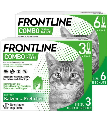 FRONTLINE COMBO® - der Kombischutz für Tier und Heim Ob Freigänger- oder Hauskatze: ein Parasitenbefall ist schnell in die eigenen vier Wände getragen und kann durch übertragbare Krankheiten für Samtpfoten sogar gefährlich werden. Mit FRONTLINE COMBO® schützen Sie Ihre Katze zuverlässig gegen Parasiten wie Zecken, Flöhe und Haarlinge. Zusätzlich zu einem Schutz auf dem Tier hemmt FRONTLINE COMBO® auch den Befall der direkten häuslichen Umgebung des Tieres durch Floheier, Flohlarven und Flohpuppen. EInfach im Nacken auf der Haut der Katze aufgetragen, verteilt sich die wasserfeste und geruchtslose Lösung mit dem natürlichen Talgfilm über die gesamte Körperoberfläche des Tieres und wirkt so effektiv gegen Parasiten auf dem Tier. Die Kombination aus zwei Wirkstoffen verhindert dabei gleichzeitig, dass sich Floheier, -larven und -puppen in der Umgebung entwickeln können. So begleitet FRONTLINE COMBO® Stubentiger und Wildkatzen auf all ihren Abenteuern wie ein unsichtbarer Schutzmantel. Vertrauen Sie auf die Nr. 1 gegen Zecken und Flöhe bei Hunden und Katzen* – mit bewiesener Wirksamkeit und sehr guter Verträglichkeit für unsere Vierbeiner. Die Anwendung von FRONTLINE COMBO® Entnehmen Sie eine Pipette aus der Verpackung. Halten Sie die Pipette aufrecht und knicken Sie die Pipettenspitze an der perforierten Stelle nach unten ab. Das Fell der Katze zwischen den Schulterblättern scheiteln und die Pipette direkt auf die Haut aufsetzen. Dann die Pipette entleeren. Von dieser Stelle aus verteilt sich der Wirkstoff innerhalb von 1 bis 2 Tagen mit dem natürlichen Talgfilm auf der gesamten Haut. Die Wirkweise von FRONTLINE COMBO® FRONTLINE COMBO® ist der Kombischutz für Tier und Heim. Nach dem Auftragen auf die Haut der Katze verteilt sich das Produkt mit dem natürlichen Talgfilm der Haut und wirkt so wie ein äußerer, unsichtbarer Schutzmantel gegen Zecken, Flöhe und Haarlinge bei Katzen und Frettchen. Für eine optimale Verteilung sollte das Tier innerhalb von 2 Tagen nach der Anwendung nicht gebadet werden. Danach ist FRONTLINE COMBO® - wie alle FRONTLINE®-Produkte - wasserfest. Die Parasiten nehmen den Wirkstoff bei Kontakt mit Fell und Haut auf und werden so innerhalb weniger Tage unschädlich gemacht. Gleichzeitig wird die Entwicklung von neuen Floheiern, -larven und -puppen auf dem Tier und in der direkten Umgebung des Tieres gehemmt. DIE HÄUFIGSTEN FRAGEN RUND UM FRONTLINE COMBO® Wie schützt FRONTLINE COMBO® mein Tier und mein Zuhause? FRONTLINE COMBO® besitzt eine Wirkstoffkombination, die bei regelmäßiger Anwendung sowohl das Tier gegen verschiedene Parasitenarten schützt, als auch den Befall der direkten häuslichen Umgebung des Tieres mit Floheiern, -larven und -puppen hemmt. Während einer der Wirkstoffe gegen Zecken, Flöhe und Haarlinge auf dem Tier wirkt und vor einem erneuten Befall schützt, verhindert der zweite enthaltene Wirkstoff, dass sich Floheier, - larven und -puppen in der direkten Umgebung des Tieres... ...