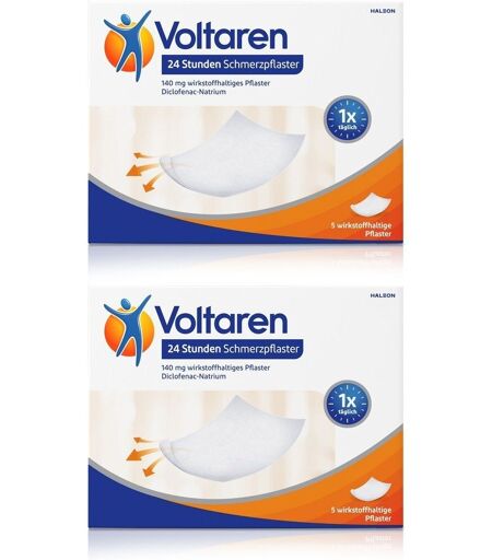 Effektive Schmerzlinderung* * nach 4-tägiger Anwendung 24 Stunden Wirkstofffreisetzung Diclofenac; entzündungshemmend; dringt tief bis zur schmerzenden Stelle vor Behandlung mit Wirkstoff statt Wärme 10 x 14 cm selbstklebendes Pflaster auf die schmerzende Stelle kleben Auf die trockene und nicht eingecremte Haut der schmerzenden Stelle kleben WIE PROFITIEREN SIE? Sie suchen nach spürbarer Schmerzlinderung für mehr Freude an der Bewegung? Der Wirkstoff Diclofenac im Voltaren 24 Stunden Schmerzpflaster lindert wirksam/effektiv akute Muskelschmerzen. Das Schmerzpflaster setzt statt Wärme den Wirkstoff Diclofenac frei. Im Gegensatz zu Wärmepflastern, enthält das Voltaren 24 Stunden Schmerzpflaster einen entzündungshemmenden Wirkstoff. Zur lokalen Schmerzbekämpfung dringt der entzündungshemmende Wirkstoff nach und nach in die Haut ein. Während der Anwendungsdauer von 24 Stunden bekämpft der Wirkstoff den Schmerz, wo er entsteht. Was Sie auch vorhaben – Voltaren unterstützt Sie dabei. WIE WIRD ES ANGEWENDET? Kleben Sie einmal täglich ein wirkstoffhaltiges Pflaster auf die schmerzende Stelle. Ziehen Sie zunächst eine Schutzfolie ab und bringen Sie das Pflaster dann auf die gesunde und intakte Haut über der schmerzenden Stelle an. Für optimale Klebefähigkeit das Pflaster auf trockener, nicht eingecremter Haut für einige Zeit (z.B. 30 Sekunden) leicht andrücken. Entfernen Sie anschließend die verbliebene Schutzfolie. Das diskrete Voltaren 24 Stunden Schmerzpflaster ist dünn und geruchlos, sodass niemand von Ihrem kleinen Geheimnis erfährt – auch Sie werden das angenehm zu tragende Pflaster kaum auf der Haut spüren. Verwenden und entsorgen Sie Arzneimittel verantwortungsbewusst. Weitere Informationen finden Sie in der Packungsbeilage. Pflichttext Voltaren Schmerzgel 11,6 mg/g Gel Wirkstoff: Diclofenac-N-Ethylethanamin. Anwendungsgebiete: Erwachsene: Zur symptomatischen Behandlung von Schmerzen bei akuten Zerrungen, Verstauchungen oder Prellungen in Folge stumpfer Traumen, z.B. Sport- und Unfallverletzungen; Schmerzen der gelenknahen Weichteile (z.B. Schleimbeutel, Sehnen, Sehnenscheiden, Bänder, Muskelansätze und Gelenkkapseln) bei Arthrose der Knie- und Fingergelenke; bei Epicondylitis; bei akuten Muskelschmerzen z. B. im Rückenbereich. Jugendliche ab 14 Jahren: Zur Kurzzeitbehandlung; zur lokalen, symptomatischen Behandlung von Schmerzen bei akuten Prellungen, Zerrungen oder Verstauchungen infolge eines stumpfen Traumas. Warnhinweis: Arzneimittel für Kinder unzugänglich aufbewahren! Enthält Propylenglycol und einen Duftstoff mit Benzylbenzoat, Benzylalkohol, Citral, Citronellol, Cumarin, D-Limonen, Eugenol, Farnesol, Geraniol und Linalool. Packungsbeilage beachten.Apothekenpflichtig. Stand:01/2024. Zu Risiken und Nebenwirkungen lesen Sie die Packungsbeilage und fragen Sie Ihre Ärztin, Ihren Arzt oder in Ihrer Apotheke* Effektive Schmerzlinderung* * nach 4-tägiger Anwendung 24 Stunden Wirkstofffreisetzung... ...