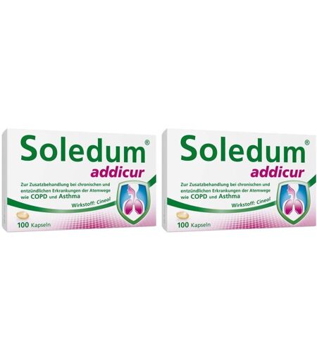 Soledum® addicur – Exazerbationen reduzieren und Lebensqualität bewahren. Reduziert als Zusatzbehandlung nachweislich Anzahl, Dauer und Schwere von Exazerbationen bei COPD-Patienten* Bekämpft die Entzündung Löst festsitzenden Schleim Gut verträglich Soledum® addicur: Zur Zusatzbehandlung bei chronischen und entzündlichen Erkrankungen der Atemwege [z. B. der Nasennebenhöhlen, Asthma, COPD (chronisch-obstruktive Lungenerkrankung)]. Symptome einer chronisch-obstruktiven Lungenkrankheit wie Auswurf, Husten und Atemnot sind für Betroffene quälend und beeinträchtigen ihren Alltag. Eine gezielte und frühzeitige Behandlung kann helfen, den Krankheitsverlauf positiv zu beeinflussen und Krankheitsschübe (Exazerbationen) zu reduzieren. Als Zusatzbehandlung bei chronischen und entzündlichen Atemwegserkrankungen hat sich der Naturwirkstoff Cineol bewährt. In der COPD-Leitlinie wird der in Soledum® addicur enthaltene Wirkstoff Cineol als Mukoregulator bezeichnet, d. h. er besitzt regulierende und normalisierende Wirkungen auf die Schleimüberproduktion. Auch in der Asthma-Behandlung kann Soledum® addicur als Zusatzmedikation eingesetzt werden, um die typischen Asthma-Symptome und ggf. auch die benötigte Kortikosteroid-Dosis schrittweise unter ärztlicher Kontrolle reduzieren. Atemwegserkrankungen: Symptome und Behandlungsoptionen COPD Bei COPD handelt es sich um eine chronische Lungenkrankheit, der eine dauerhafte Entzündung der Bronchialschleimhaut zugrunde liegt. Die Abkürzung steht für die englische Bezeichnung der Erkrankung: chronic obstructive pulmonary disease“, zu Deutsch chronisch-obstruktive Lungenerkrankung“. Der Begriff obstruktiv“ beschreibt, dass bei COPD die Atemwege verengt sind. Das kann sich durch Atemnot, zunächst unter Belastung, später auch im Ruhezustand, und in Form von Husten sowie Auswurf äußern. Eine gezielte und frühzeitige Behandlung kann helfen, den Krankheitsverlauf positiv zu beeinflussen. Als Zusatzbehandlung bei chronischen und entzündlichen Atemwegserkrankungen hat sich der in Soledum® addicur enthaltene Naturwirkstoff Cineol mit seiner entzündungshemmenden und schleimlösenden Wirkung bewährt und kann Betroffenen so helfen, ihre Lebensqualität zu bewahren. Asthma Unter Asthma wird in der Regel Asthma bronchiale verstanden. Bei Bronchialasthma verengen sich die Atemwege aufgrund einer bronchialen Übererregbarkeit anfallsartig so, dass der Betroffene schlecht Luft bekommt. Auslöser können äußere Einflüsse (z. B. Einatmen von Allergenen) oder aber körpereigene Reize (z. B. sportliche Belastung, Stress) sein. Neben der ärztlich verordneten Basismedikation kann zur Zusatzbehandlung das Arzneimittel Soledum® addicur mit dem Naturwirkstoff Cineol eingesetzt werden. Soledum® addicur. Exazerbationen reduzieren. Lebensqualität bewahren. Wirksam, gut verträglich, mit nachgewiesener Mehrfachwirkung – der reine Naturstoff Cineol, der Wirkstoff in den Soledum®-Arzneimitteln, wirkt in den oberen und unteren Atemwegen und hat sich... ...