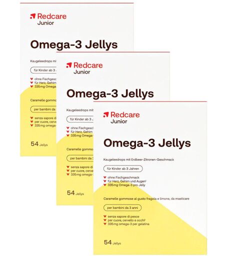 Nahrungsergänzungsmittel zur Verwendung als Teil einer abwechslungsreichen, ausgewogenen Ernährung und eines gesunden Lebensstils. Redcare Junior Omega-3 Jellys Omega-3-Fettsäuren sind essenzielle Nährstoffe, die der Körper nicht selbst herstellen kann. Deshalb ist eine regelmäßige Aufnahme über die Nahrung unverzichtbar. Die Redcare Junior Omega-3 Jellys liefern hochwertiges Omega-3 mit den wertvollen Fettsäuren EPA (Eicosapentaensäure) und DHA (Docosahexaensäure) sowie Vitamin D – für eine rundum optimale Versorgung. EPA und DHA … leisten einen Beitrag zu einer normalen Herzfunktion … tragen zum Erhalt eines normalen Blutdrucks und einer normalen Triglycerid-Konzentration im Blut bei DHA leistet zusätzlich einen Beitrag zum Erhalt einer normalen Gehirnfunktion und Sehkraft Innovative Concordix-Technologie für maximale Nährstoffaufnahme Jedes Jelly enthält hochwertiges Omega-3 aus Fischöl, hergestellt mit der Concordix-Technologie. Diese norwegische Innovation optimiert die Nährstoffaufnahme, indem sie die natürliche Struktur von Omega-3 in Lebensmittelns nachahmt. Milliarden kleinster Öltröpfchen erhöhen die Oberfläche der Nährstoffe, was die Bioverfügbarkeit verbessert. Diese patentierte Technologie erhöht die Absorption der Fettnährstoffe um 44 Prozent im Vergleich zu herkömmliche Softgels. Die Redcare Junior Omega-3 Jellys überzeugen mit einem köstlichen Erdbeer-Zitronen-Geschmack – perfekt für Kinder. Die Einnahme ist unkompliziert: Kinder von 3 bis 9 Jahren: Ein Jelly pro Tag. Kinder ab 10 Jahren: Zwei Jellys pro Tag. Mit einer Packung von 54 Jellys reicht der Vorrat für 28 bis 54 Tage – je nach Dosierung. So ist Ihr Kind täglich mit bestem Omega-3 versorgt. Zutaten: EPA- und DHA-reiches Fischölkonzentrat (Clupea harengus, Sardina pilchardus, Scomber scombrus, Thunnus, Pazifik (FAO 61/71/77/87) verarbeitet in Norwegen), Süßungsmittel: Xylit, Sorbit; Wasser, Gelatine (Rind), Säureregulator: Natriumcitrate, Äpfelsäure; natürliche Aromen; Antioxidationsmittel: Ascorbinsäure, Farbstoff: Paprikaextrakt, Cholecalciferol Nährwerte: Für 1 Jelly¹ Für 2 Jellys² NRV³Fischöl500 mg1.000 mg- davon Omega-3-Fettsäuren335 mg670 mg- davon DHA250 mg500 mg- davon EPA50 mg100 mg-Vitamin D5,0 μg10,0 μg100 % / 200 % 1 angegebene tägliche Verzehrmenge für Kinder von 3 - 9 Jahren 2 angegebene tägliche Verzehrmenge für Kinder und Jugendliche ab 10 Jahren 3 Anteil an der Nährstoffreferenzmenge Hinweise: Die Tagesdosierung variiert je nach Alter des Kindes. Die empfohlene tägliche Verzehrmenge darf nicht überschritten werden. Dieses Produkt ist kein Ersatz für eine ausgewogene, abwechslungsreiche Ernährung und eine gesunde Lebensweise. Empfohlen für Kinder und Jugendliche von 3–18 Jahren. Nicht geeignet für schwangere und stillende Frauen. Aufbewahrung: Außerhalb der Reichweite von kleinen Kindern aufbewahren. Kühl, trocken und lichtgeschützt lagern. Nettofüllmenge: 3 x 54 Jellys Herstellerdaten:... ...