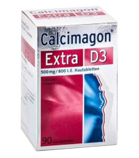 Calcimagon® Extra D3 KautablettenWirkstoffe: Calciumcarbonat und ColecalciferolZusammensetzung:1 Kautablette enthält: 250 mg Calciumcarbonat (entsprechend 500 mg Calcium), 8 mg Colecalciferol -Trockenkonzentrat (entsprechend 20 μg Colecalciferol = 800 I.E. Vitamin D3);Sonstige Bestandteile:Sorbitol (Ph.Eur., E420), Povidon, Isomalt (E953), Zitronen-Aroma, Magnesiumstearat, Aspartam (E951), Mono-und Diglyceride von Fettsäuren, All-rac-alpha-Tocopherol (Ph.Eur.), Sucrose, modifizierte Maisstärke, mittelkettige Triglyceride, wasserfreies kolloidales Siliciumoxid, Natriumascorbat. Anwendungsgebiete:Vorbeugung und Behandlung von Vitamin D-und Calcium-Mangelzuständen bei älteren Menschen.Als Vitamin D-und Calciumsupplement zur Unterstützung einer spezifischen Osteoporosetherapie bei Patienten, bei denen das Risiko eines Vitamin-D-und Calcium- Mangels besteht. Gegenanzeigen:Krankheitszustände, die Hypercalcämie oder Hypercalcurie zur Folge haben; schwere Niereninsuffizienz, Nierensteine, Hypervitaminose D. Überempfindlichkeit gegen die Wirkstoffe oder einen der sonstigen Bestandteile,Kinder und Jugendliche Nebenwirkungen:Gelegentlich: Hypercalcämie, Hypercalcurie;Selten: Verstopfung, Blähungen, Übelkeit, Abdominalschmerzen, Diarrhoe; Sehr selten: Dyspepsie; Milch-Alkali-Syndrom, üblicherweise nur bei Überdosierung; Pruritus, Hautausschlag, Urtikaria; Nicht bekannt:Überempfindlichkeitsreaktionen wie Angioödem oder Kehlkopfödem. Besondere Patientengruppen: Patienten mit Niereninsuffizienz: Potentielles Risiko für Hyperphosphatämie, Nephrolithiasisund Nephrocalcinose Warnhinweis:Enthält Aspartam, Sorbitol, Isomalt und Sucrose. Packungsbeilage beachten. ...