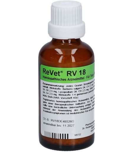 ReVet® RV 18 Globuli für Tiere Globuli zum Eingeben Hinweis: Bei anhaltenden, unklaren, periodisch oder neu auftretenden Beschwerden, Fieber oder schweren Störungen des Allgemeinbefindens sollte umgehend ein Tierarzt aufgesucht werden. Dosierung: Soweit nicht anders verordnet und in Abhängigkeit vom Körpergewicht erhalten: Heimtiere (Mäuse, Ratten, Meerschweinchen, Marderartige), Ziervögel ca. 1 bis 3 Globuli Kaninchen, Tauben ca. 1 bis 3 Globuli Welpen, Katzen ca. 2 bis 5 Globuli Hunde ca. 5 bis 10 Globuli Schafe, Ziegen ca. 10 Globuli Kälber, Schweine ca. 10 bis 20 Globuli Pferde, Rinder ca. 30 bis 50 Globuli Bei den Tierarten, bei denen keine individuelle Dosierung möglich ist, z. B. bei Heimtieren (Mäuse, Ratten, Meerschweinchen, Marderartige), Kaninchen, Geflügel (Hühner, Puten, Gänse, Enten), Fischen (Karpfen, Forellen), Ziervögeln, Amphibien und Reptilien kann eine Auflösung von ca. 20 Globuli pro Liter im Trink-, Badewasser oder Tauchbad angewendet werden. ReVet® RV 18 – oral – (Globuli) wird in etwas Wasser aufgelöst eingegeben. Die Globuli dürfen auch aufgelöst mit etwas Nahrung oder Tränke verabreicht werden. Die Häufigkeit und Dauer der Anwendung richtet sich in erster Linie nach den Grundsätzen der Homöopathie, wonach bei beginnender Besserung seltener dosiert wird und nach Erreichen des Normalzustandes zunächst keine weitere Anwendung erforderlich ist. In akuten Fällen: Soweit nicht anders verordnet, 3 mal pro Tag eine Dosis über einige Tage; mit zunehmender Besserung seltener. Bei kolikartigen Zuständen u. ä. darf die orale Gabe alle 15-30 Minuten erfolgen bis zur Besserung. In chronischen Fällen: Soweit nicht anders verordnet, 1- bis 2-mal pro Tag eine Dosis über einige Wochen; mit zunehmender Besserung seltener. Für die Behandlung von größeren Tierbeständen siehe Packungsbeilage. Bitte beachten Sie, dass die Häufigkeit der Anwendung von ReVet®-Präparat zu ReVet®-Präparat unterschiedlich ist und sich außerdem danach richtet, ob die Erkrankung des Tieres akut oder chronisch ist. Die verabreichte Menge pro Gabe ist dagegen für jede Tierart und -größe und bei allen ReVet®-Präparaten gleich. Inhaltsstoffe: In 42 g Streukügelchen sind verarbeitet: Wirkstoffe: Berberis vulgaris Dil. C4, Cantharis Dil. C6, Lycopodium Dil. C9, Sabal serrulatum Dil. C4, je 105 mg. Wirkstoffe 1 bis 4 gemeinsam potenziert über die letzte Stufe (HAB, Vorschrift 40a). ...