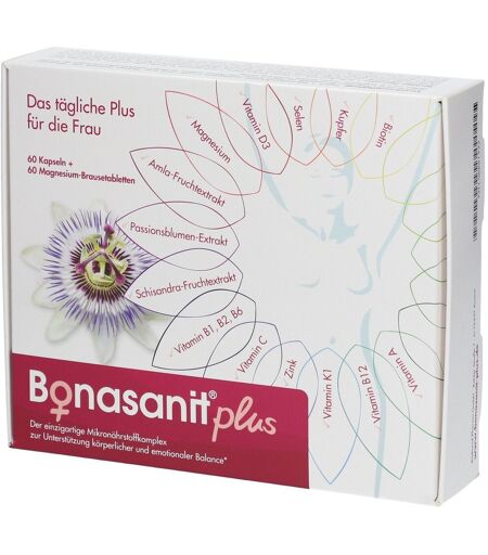 Nahrungsergänzungsmittel sind kein Ersatz für eine ausgewogene und abwechslungsreiche Ernährung und eine gesunde Lebensweise.Bonasanit®plusBonasanit®plus ist für Frauen, die unter dem Prämenstruellen Syndrom (PMS) leiden. Bonasanit®plus stellt für Frauen ein innovatives multifaktorielles Management bei PMS dar, das eine einzigartige Kombination aus wertvollen Mikronährstoffen wie Pflanzenextrakten, Vitaminen (u.a. das Zyklus Vitamin B6, Spurenelementen und Coenzym Q10 enthält. Genauso reguliert Bonasanit®plus den Stoffwechsel- und Hormonhaushalt.Das Ergebnis: Körper und Seele sind wieder in ihrem natürlichen Gleichgewicht und spürbar belastbarer. Zutaten: Magnesium-Brausetablette:Säuerungsmittel Zitronensäure, Magnesiumcarbonat (18,6 g/100 g), Säureregulator Natriumhydrogencarbonat, Inulin, Aroma Passionsfrucht, Aroma Kokos, Maisstärke.Mikronährstoff-Kapsel:Schisandra-Fruchtextrakt, Passionsblumen- Extrakt, Emblica-Fruchtextrakt, L-Ascorbinsäure (Vit. C), Hydroxypropylmethylcellulose (Kapselhüllle) E464, Zinkgluconat, Coenzym Q10, Pyridoxin HCL (Vit. B6), Calciumcarbonat, Sucrose, modifizierte Stärke E1450, Stabilisator Gummi Arabicum E414, Maltodextrin, pflanzliches Öl, Maisstärke, Kupfergluconat, Farbstoff- E171, Thiaminmononitrat (Vit. B1), Riboflavin (Vit. B2), Kieselerde, Trennmittel Magnesiumsalze von Speisefettsäuren E470b, Chrom-III-picolinat, Antioxidationsmittel Alpha-Tocopherol E307, Trennmittel Calciumphosphat E341, Retinylpalmitat (Vit. A), Natriumselenat, Biotin, Natriummolybdatdihydrat, Cholecalciferol (Vit. D3), Phytomenadion (Vit. K1), Cyanocobalamin (Vit. B12)Nährwerte: Nährwert pro Kapsel pro Brausetablette Summe Energie 3,86 kJ / 0,88 kcal 34,41 kJ / 8,20 kcal 38,09 kJ / 9,08 kcal Eiweiß 0,009 g 0,0004 g 0,0094 g Kohlenhydrate 0,21 g 0,1280 g 0,338 g Fett 0,0004 g 0,0106 g 0,011 g Broteinheiten 0,018 0,0107 0,0287 Verzehrempfehlung:Täglich 1 Mikronährstoff-Kapsel (= Tagesportion) vorzugsweise zu oder nach einer Mahlzeit (Frühstück oder Mittagessen) nehmen sowie 1 Magnesium-Brausetablette am Abend in einem Glas Wasser auflösen, bei Bedarf individuell süßen und trinken (um das volle Wirkungspotenzial auszuschöpfen, ist bei manchen Stoffen – wie z.B. Magnesium – eine versetzte Einnahme wichtig)Hinweis:Die angegebene empfohlene tägliche Verzehrmenge darf nicht überschritten werden.Aufbewahrung: Kühl (6-25 °C) und lichtgeschützt lagern. Außerhalb der Reichweite von kleinen Kindern aufbewahren.Nettofüllmenge: 60 Kapseln + 60 Brausetabletten = 258 gHerstellerdaten: Biokanol Pharma GmbH Kehler Str. 776437 Rastatt ...