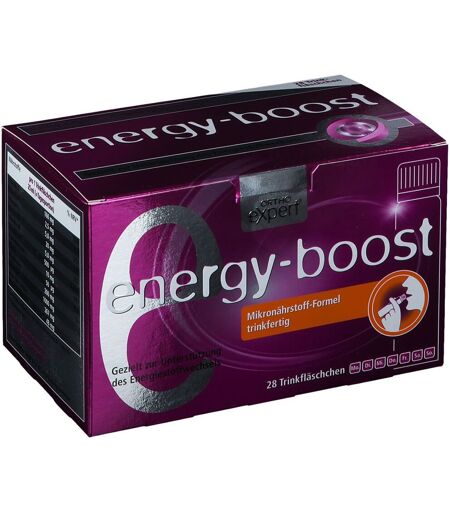 Nahrungsergänzungsmittel sind kein Ersatz für eine abwechslungsreiche und ausgewogene Ernährung und eine gesunde Lebensweise. Energy-boost Orthoexpert®Nahrungsergänzungsmittel mit Vitaminen, Mineralstoffen, Coenzym Q10, L-Carnitin und Taurin. Mit Zucker. energy-boost enthält mit den Vitaminen B1, B2, B6, B12 sowie Eisen und Magnesium die entscheidenden Mikronährstoffe zur Unterstützung des Energiestoffwechsels. Gezielt zur Unterstützung des Energiestoffwechsels. Beruf, Familie, Sport und Freizeit erfordern Tag für Tag eine Menge Energie. Um die volle Leistung zu bringen und dem Stress besser gewachsen zu sein, empfiehlt es sich, gezielt den Energiestoff- wechsel zu unterstützen. Dabei kommt es auf die Dosierung und Kombination der erforderlichen Mikronährstoffe an.Die einzigartige Formulierung für mehr Vitalität und Power. energy-boost enthält mit den Vitaminen B1, B2, B6, B12 sowie Magnesium entscheidende Mikronährstoffe zur Unterstützung des Energiestoffwechsels. Pantothensäure (Vitamin B5) leistet einen Beitrag zur Aufrechterhaltung der geistigen Leistungsfähigkeit. Die Vitamine B2, B6, B12 sowie Magnesium tragen zur Verringerung von Müdigkeit und Ermüdung bei. Zudem enthält energy-boost hochdosiertes L-Carnitin und Mate Tee Extrakt.energy-boost ist eine speziell entwickelte hoch- konzentrierte Mikronährstoff-Formel zur Nahrungs- ergänzung. energy-boost eignet sich für die lang- fristige Einnahme.Zutaten:Wasser; Orangensaftkonzentrat; Zucker; Stabilisator: Glycerin; L-Carnitin; Säuerungsmittel: Citronensäure; Taurin; Vitamin C; Sauerkirschsaft-Konzentrat; Magnesiumcarbonat; Aroma: Kirsche; Eisenpyrophosphat; Konservierungsstoff: Kaliumsorbat; Zinkcitrat; Coenzym Q10; Trennmittel: Kaliumcarbonat; Niacin; Calcium-Dpantothenat; Vitamin B1; Vitamin B2; Vitamin B6; Trennmittel: Siliciumdioxid; Emulgator: Zuckerester von Speisefettsäuren; Vitamin B12; Folsäure; Natriumselenat; Biotin; Vitamin D.Nährwerte: Durchschnittliche Nährwertepro Trinkfläschchen25 ml (= Tagesportion)% empf.TagesdosisL-Carnitin2000 mg-Taurin500 mg-Coenzym Q1030 mg-Vitamin C500 mg625Vitamin B15,0 mg455Vitamin B25,0 mg357Niacin (NE**)20 mg125Vitamin B65,0 mg357Vitamin B12500 µg20000Folsäure500 µg250Vitamin D5,0 µg100Pantothensäure10 mg167Biotin165 µg330Magnesium100 mg27Eisen10 mg71Zink10 mg100Selen50 µg91Verzehrsempfehlung: Täglich während oder nach einer Mahlzeit den Inhalt eines Trinkfläschchens, ggf. verdünnt mit Wasser oder Saft, einnehmen. Vor Gebrauch den Deckel im Uhrzeigersinn bis zum Anschlag fest zudrehen. Gut schütteln, das Fläschchen öffnen und die Flüssigkeit trinken.Hinweis:Die angegebene empfohlene Tagesmenge darf nicht überschritten werden.Aufbewahrung: Kühl (6-25 °C) und lichtgeschützt lagern. Außerhalb der Reichweite von kleinen Kindern aufbewahren.Nettofüllmenge: 28 x 25 mlHerstellerdaten: Weber & Weber GmbH & Co. KG Herrschinger Straße 3382266 Inning am Ammersee ...