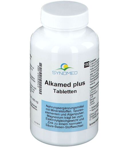 Nahrungsergänzungsmittel sind kein Ersatz für eine ausgewogene und abwechslungsreiche Ernährung und eine gesunde Lebensweise. Alkamed plus Tabletten Nahrungsergänzungsmittel mit Mineralstoffen, Spurenelementen und Algenpulver. Magnesium trägt bei zum Elektrolytgleichgewicht und Zink zu einem normalen Säure-Basen-Stoffwechsel. Zutaten: Calciumcarbonat, Magnesiumcarbonat, Füllstoff Mikrokristalline Cellulose, Säureregulator Kaliumhydrogencarbonat und Kaliumcitrat, Lithothamnium Calcareum-Pulver (Meeresalge mit Calcium), Zinkgluconat, Überzugsmittel Schellack, Trennmittel Magnesiumsalze der Speisefettsäuren (pflanzlich), Trennmittel Siliciumdioxid, Mangancitrat, Chrom(III)-chlorid, Natriumselenit. Ohne Lactose, Hefe, Farbstoffe oder Konservierungsstoffe, Glutenfrei, vegetarisch. Nährwertangaben Tagesverzehrsmenge (max. 6 Tabletten) enthält: Lithothamnium-Pulver 120 mg (Ca = 40 mg) (**) Calciumcarbonat 2.730 mg (Ca = 1.080 mg) (140%*) Magnesiumcarbonat 1440 mg (Mg = 360 mg) (96%*) Zinkgluconat 74 mg (Zn = 10 mg) (100%*) Mangancitrat 7,2 mg (Mn = 2 mg) (100%*) Natriumselenit 121 µg (Se = 55 µg) (100%*) Chrom (III)-chlorid 206 µg (Cr = 40 µg) (100%*) *Referenzmenge nach LMIV (NRV) **Keine Empfehlung der LMIV (NRV). Verzehrempfehlung: Täglich 3 x jeweils 1-2 Tabletten vor den Hauptmahlzeiten optimal mit warmen Wasser verzehren. Hinweis: Die angegebene empfohlene Tagesmenge darf nicht überschritten werden. Aufbewahrung: Kühl (6-25 °C) und lichtgeschützt lagern. Außerhalb der Reichweite von kleinen Kindern aufbewahren. Nettofüllmenge: 180 Tabletten = 158,4 g HerstellerSynomed GmbHFlamweg 132-13425335 Elmshorn ...