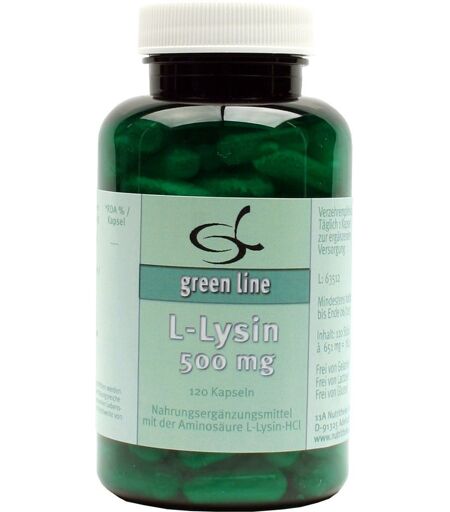 Nahrungsergänzungsmittel sind kein Ersatz für eine ausgewogene Ernährung und gesunde Lebensweise.green line L-Lysin 500 mg Nahrungsergänzungsmittel mit L-Lysin-HCl aus puren, hochwertigen RohstoffenZutaten: L-Lysin-HCl, Hydroxypropylmethylcellulose, Füllstoff mikrokristalline CelluloseFrei von GlutenFrei von LactoseFrei von GelatineFrei von FarbstoffenOhne Zusatz von Konservierungsstoffen Zusammensetzung pro KapselL-Lysin-HCl500 mgVerzehrempfehlung: 1 Kapsel Pro TagHinweis: Die angegebene empfohlene Tagesmenge darf nicht überschritten werden. Aufbewahrung: Kühl (6-25 °C) und lichtgeschützt lagern. Außerhalb der Reichweite von kleinen Kindern aufbewahren. Nettofüllmenge:120 Kps = 74,4 gHersteller:11A nutritheke GmbHHauptstraße 3a91341 Röttenbach ...