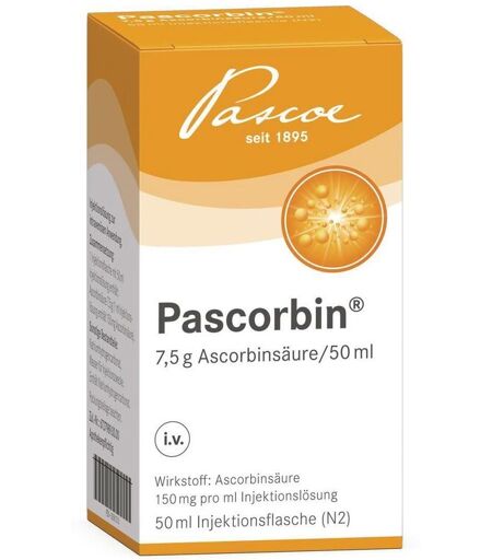 Pascorbin® bei klinischem Vitamin-C-Mangel, der über Ernährung oder Nahrungsergänzungsmittel nicht ausgeglichen werden kann. Vorteile einer Vitamin-C-Infusion: Pascorbin® ist das erste und einzige zugelassene Produkt mit 7,5 g Vitamin C gelangt direkt in die Blutbahn und versorgt umgehend mit Vitamin C deutlich schnellere und höhere Verfügbarkeit als mit Vitamin-C-Tabletten lagerfähig bei Raumtemperatur (bis 25 °C) sofortige 100%ige Bioverfügbarkeit ohne Konservierungsstoffe* und Stabilisatoren *Gemäß den Vorgaben von Ph. Eur. 10. Ausgabe, 5. Nachtrag, Seite 831 Vitamin-C-Infusionen für Ihre Gesundheit! Ein klinischer, also ausgeprägter Vitamin-C-Mangel kann in verschiedenen Lebenssituationen auftreten, zum Beispiel: bei akuten und chronischen Infektionen unausgewogener Ernährung chronisch-entzündlichen Erkrankungen nach Operationen. Auch Personen, die rauchen sowie diejenigen mit verminderter körperlicher Leistungsfähigkeit, chronischer Müdigkeit, erhöhter Erschöpfbarkeit und Reizbarkeit sowie verminderter Infekt-Resistenz können von einem Vitamin-C-Mangel betroffen sein. Infusionen sind ein möglicher Weg, um diesen Mangel auszugleichen: Normalerweise wird Vitamin C, welches wir über die Nahrung zu uns nehmen, in unserem Körper über spezielle Transportmoleküle im Dünndarm aufgenommen und anschließend in den Blutkreislauf weitergeleitet. Dieser Weg ist aber begrenzt, da es nur eine gewisse Anzahl dieser Transporter gibt. Deshalb kann es sein, dass nur ein Teil der Vitamin-C-Menge, die man oral aufnimmt, ins Blut gelangt. Eine mögliche Option, falls ein Mangel eben nicht über die Nahrung ausgeglichen werden kann, sind Infusionen. Hierbei wird das Vitamin C direkt ins Blut verabreicht und kann in vollständiger Menge aufgenommen werden – man spricht von einer 100%igen Bioverfügbarkeit. So können durch eine Infusion wesentlich höhere Blutspiegel im Körper erreicht werden, als es durch Nahrung oder Tabletten möglich wäre. Auf diese Weise könnte ein Vitamin-C-Mangel ausgeglichen werden. Anwendungshinweise: Führen Sie mit Injektionen keine Selbstbehandlung durch. Die Therapie muss von einem Fachkundigen (z. B. Arzt oder Heilpraktiker) durchgeführt werden. Die Ascorbinsäure in Pascorbin 7,5 g ist hochkonzentriert. Deshalb muss das Produkt mit einer geeigneten Trägerlösung verdünnt werden. Zur peripher-venösen Kurzinfusion sind 50 ml Pascorbin mit mind. 100 ml Trägerlösung zu verdünnen und langsam zu infundieren. Wissenswertes zu Vitamin C: Vitamin C ist ein wasserlösliches Vitamin und der Körper kann es daher nicht bzw. nur sehr begrenzt speichern (im Gegensatz zu fettlöslichen Vitaminen wie Vitamin E). Viele Tiere können Vitamin C selbst im Körper herstellen – wir Menschen haben diese Fähigkeit im Verlauf der Evolution verloren. Umso wichtiger ist es, Vitamin C regelmäßig von außen zuzuführen. Pascorbin® Wirkstoff: Ascorbinsäure 150 mg pro ml Injektionslösung. Zur Therapie von klinischen Vitamin-C-Mangelzuständen, die ernährungsmäßig nicht behoben oder... ...