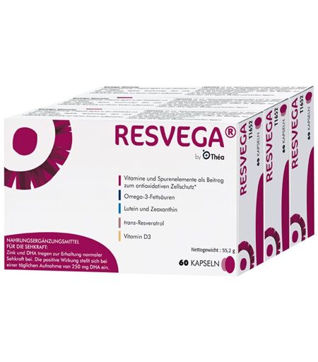 Bitte achten Sie auf eine abwechslungsreiche und ausgewogene Ernährung und gesunde Lebensweise. Antioxidativ wirksame Vitamine und Spurenelemente, Omega-3-Fettsäuren, Lutein und Zeaxanthin und trans-Resveratrol.RESVEGA® ist ein Nahrungsergänzungsmittel mit antioxidativ wirksamen Vitaminen und Spurenelementen*, Omega-3-Fettsäuren, Lutein und Zeaxanthin und trans-Resveratrol.Vitamine und Spurenelemente: Vitamin E: Vitamin E kommt in pflanzlichen Ölen vor. Vitamin C: Vitamin C kommt in Früchten und Gemüsen vor. Zink: Zink trägt zur Erhaltung normaler Sehkraft bei. Es kommt besonders in Fleisch und Fisch vor. Kupfer: Kupfer kommt in Innereien, Weichtieren und Trockenfrüchten vor. Lutein und Zeaxanthin Lutein und Zeaxanthin sind gelbe Farbpigmente, die in hoher Konzentration in grünem Gemüse wie Spinat, Brokkoli und Salat vorkommen. Omega-3-Fettsäuren (DHA & EPA) Docosahexaensäure (DHA) und Eicosapentaensäure (EPA) sind zwei mehrfach ungesättigte Fettsäuren, die zur Gruppe der Omega-3-Fettsauren gehören. Omega- 3-Fettsäuren sind essentielle Fettsäuren, die der Körper nicht selbst bilden kann und daher über die Nahrung aufgenommen werden müssen. Mehrfach ungesättigte Fettsäuren, wie EPA und DHA kann der Körper aus anderen Omega-3-Fettsäuren selbst herstellen. Gute Quellen fur Omega-3-Fettsäuren sind fettreiche Fische wieThunfisch, Lachs und Hering.Trans-ResveratrolTrans-Resveratrol kommt in Früchten, insbesondere in Weintrauben und im Wein vor. ZutatenFischöl (Omega-3-Fettsäuren); Gelatine; Wasser; Vitamin C (Ascorbinsäure); Feuchthaltemittel: Glycerin, Sorbit; Emulgator: Glycerylmonostearat; trans-Resveratrol; Lutein-Suspension in Safloröl; Vitamin E (DL-α-Tocopherylacetat); Trennmittel: Bienenwachs; Emulgator: Sojalecithin; Zinkoxid; Zeaxanthin-Suspension in Safloröl; Kupfersulfat; Farbstoffe: schwarzes Eisenoxid, rotes Eisenoxid.Zusammensetzung RESVEGA®Inhaltsstoffe Tagesdosis(2 Kapseln)% NRV*Antioxidative Vitamineund Spurenelemente__Vitamin C120 mg150%Vitamin E30 mg α-TE250%Zink12,5 mg125%Kupfer1 mg100%Essentielle Fettsäuren Fischöl (EPAX®-Premium-Qualität)950 mg_davon 70% Omega-3-Fettsäuren606 mg_EPA172 mg_DHA 366 mg_Lutein10 mg_Zeaxanthin2 mg_trans-Resveratrol 60 mg_1 x 2 Kapseln / Tag***Nährstoffbezugswerte (nutrient reference values) gemäß VO (EU) Nr. 1169/2011.**Die empfohlene Tagesdosis sollte nicht überschritten werden. Nährwerttabelle:Brennwertpro Kapsel (g)pro 100 gkcal6,78 kcal/g678,04 kcal/100gkJ28,09 kJ/g2809,4 kJ/100gFett- davon gesättigte Fettsäuren0,580,0957,88,7Kohlenhydrate- davon Zucker0,230,001422,90,14Eiweiss0,1716,6Salz0,00140,14*Nährstoffbezugswert (nutrient reference values) VO (EU) No 1169/2011VerzehrempfehlungTäglich zwei Kapseln mit etwas Wasser zu einer Mahlzeit einnehmen.Hinweis:Die angegebene empfohlene Tagesmenge darf nicht überschritten werden.Aufbewahrung: Kühl (6-25 °C) und lichtgeschützt lagern. Außerhalb der Reichweite von kleinen Kindern aufbewahren.Nettofüllmenge in mehreren Größen... ...