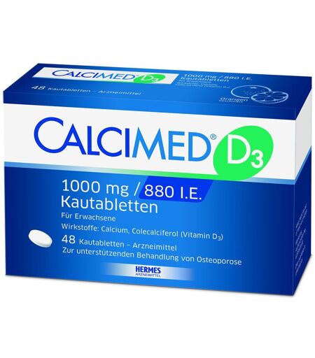 Anwendungsgebiete:Zur Prophylaxe und Behandlung von Calcium- und Vitamin-D-Mangelzuständen bei älteren Menschen; als Calcium- und Vitamin-D-Ergänzung zur unterstützenden Behandlung der Osteoporose (Knochenschwund).Produktinformation:Die Knochen befinden sich in einem ständigen Umbauprozess. Etwa bis zum 30. Lebensjahr überwiegt der Knochenaufbau. Alte Knochenzellen werden durch neue Zellen ersetzt, kleine Bruchstellen repariert, Calcium wird in den Knochen eingelagert. Um das 40. Lebensjahr verlangsamt sich dieser Erneuerungs¬prozess und katabole Prozesse überwiegen. Die Knochen verlieren an Dichte und somit an Stabilität. Schreitet dieser Verlust rasch voran, kann es zur Osteoporose kommen. Bei Frauen steigt das Erkrankungsrisiko mit dem Eintritt in die Wechseljahre stark an, da eine verminderte Östrogenproduktion den Knochenabbau beschleunigen kann. Demzufolge sind Frauen besonders betroffen. CALCIMED® D3 hilft dem Körper, die abnehmende Knochen-festigkeit wieder zu stabilisieren. Dafür sorgen der zentrale Knochenbaustein Calcium und das Sonnen-Vitamin D3, das die Calciumaufnahme fördert und die Einlagerung von Calcium in die Knochen unterstützt. So verleiht Calcium im Zusammenspiel mit Vitamin D3 den Knochen Festigkeit und Stabilität.Das Produkt CALCIMED® D3 1000 mg / 880 I.E. richtet sich in erster Linie an die Calcium Vermeider: Sie ernähren sich nicht ausgewogen, evtl. werden Milchprodukte nicht gut vertragen und deshalb gemieden. Die mögliche Folge: ein Calcium-Mangel.Wirkstoffe: Calcium und Colecalciferol (Vitamin D3). Anwendungsgebiet: Zur Prophylaxe und Behandlung von Calcium- und Vitamin-D-Mangelzuständen bei älteren Menschen; als Calcium- und Vitamin-D-Ergänzung zur unterstützenden Behandlung der Osteoporose (Knochenschwund). Enthält Aspartam (E951), Sorbitol (E420), Isomalt (E953) und Sucrose (Zucker).Knochengesundheit:Die Knochen erreichen zwischen dem 20. und 30. Lebensjahr ihre größte Dichte. Ab dem 40. Lebensjahr kann ein langsamer Abbau einsetzen. Vor allem Frauen in oder nach den Wechseljahren verlieren Knochenmasse und sind daher vergleichsweise häufig von Knochenbrüchen betroffen. Bei Männern kommt es verstärkt nach dem 70. Lebensjahr zu Knochenabbau. Bei Anzeichen von Osteoporose ist die Einnahme von Calcium-Vitamin D3-Präparaten deshalb besonders wichtig.Die wichtigsten Knochennährstoffe:Calcium ist die entscheidende Stützsubstanz der Knochen. Calcium zählt zu den kritischen Nährstoffen. Heranwachsende, Frauen und ältere Menschen nehmen oft zu wenig Calcium mit der Nahrung auf. Schwangere und Stillende weisen einen besonders hohen Calciumbedarf auf, den sie nicht immer adäquat decken. Zudem besteht relativ häufig eine Abneigung gegenüber Milch und Milchprodukten.Vitamin D3 ist unentbehrlich für die Aufnahme von Calcium aus dem Darm sowie die Einlagerung in die Knochen. Durch zu wenig Sonnenstrahlung (besonders in den Wintermonaten) kann der Körper oft nicht ausreichend Vitamin D3 bilden.Zusammensetzung:Jede Kautablette... ...