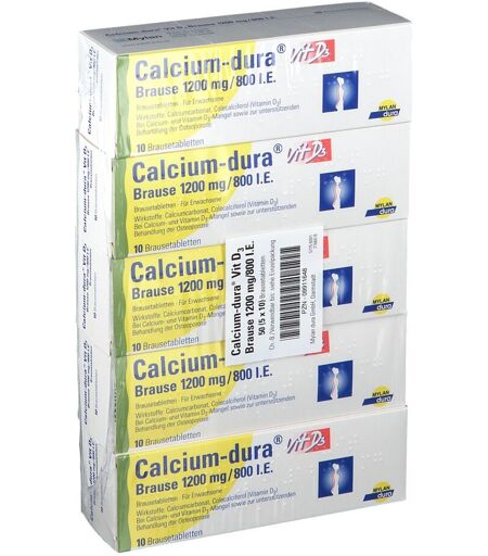 Wirkstoffe: Calciumcarbonat und Colecalciferol (Vitamin D)Anwendungsgebiete: Bei nachgewiesenem Calcium- und Vitamin-D3-Mangel sowie zur unterstützenden Behandlung von Osteoporose.Warnhinweis: Enthält Sucrose, Sorbitol, partiell hydriertes Sojaöl und Natriumverbindungen.Stand:Oktober 2010Hersteller:Mylan dura GmbH, Postfach 10 06 35, 64206 Darmstadt Zu Risiken und Nebenwirkungen lesen Sie die Packungsbeilage und fragen Sie Ihren Arzt oder Apotheker. ...