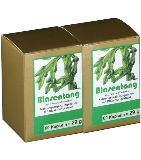 Nahrungsergänzungsmittel sind kein Ersatz für eine ausgewogene und abwechslungsreiche Ernährung und eine gesunde Lebensweise. Blasentang KapselnZutaten:Lactose (=Milchzucker), Gelatine (=Kapselhülle), Blasentangextrakt (8%= 40 mg pro Kapsel), Trennmittel: Magnesiumstearat.Zwei Kapseln enthalten:80 mg BlasentangextraktVerzehrempfehlung:Zwei Kapseln täglich.Hinweis:Die angegebene empfohlene Tagesmenge darf nicht überschritten werden. Aufbewahrung: Kühl (6-25 °C) und lichtgeschützt lagern. Außerhalb der Reichweite von kleinen Kindern aufbewahren.Wichtiger Hinweis:Dieses Produkt enthält Jod. Bei einer Überempfindlichkeit gegen Jod (=Jodallergie) darf dieses Produkt nicht eingenommen werden.Nettofüllmenge 120 Kapseln = 29 g HerstellerAalborg Pharma GmbHA-1030 Wien ...