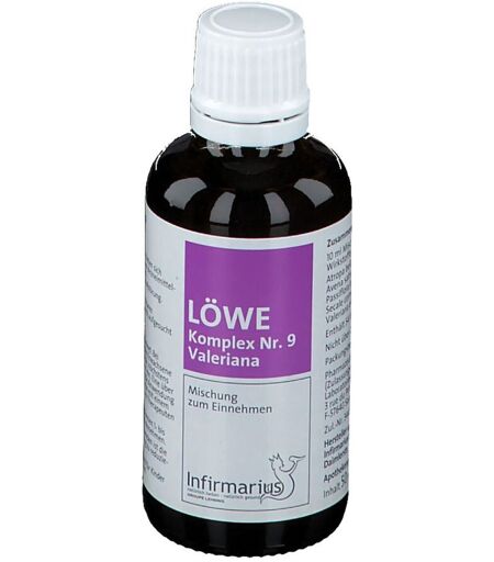 Homöopathisches Arzneimittel bei nervösen Erkrankungen.Zusammensetzung:10 ml Mischung enthalten (Wirkstoffe):Atropa bella-donna Dil. D42,0 mlAvena sativa Dil. D12,0 mlPassiflora incarnata Dil. D12,0 mlSecale cornutum Dil. D42,0 mlValeriana officinalis Ø2,0 mlSonstige Bestandteile:Enthält 54 Vol.-% AlkoholDarreichungsform und Inhalt:Mischung zum Einnehmen 50 ml, 100 mlGegenanzeigen:Im Folgenden wird beschrieben, wann Sie LÖWE-Komplex Nr. 9 Valeriana nicht oder nur nach sorgfältiger Prüfung durch Ihren Arzt anwenden dürfen.LÖWE-Komplex Nr. 9 Valeriana ist bei Patienten mit Überempfindlichkeit gegen Hafergluten sowie bei Alkoholkranken nicht anzuwenden. Wann dürfen Sie LÖWE-Komplex Nr. 9 Valeriana erst nach Rücksprache mit dem Arzt anwenden?Wegen des Alkoholgehaltes soll LÖWE-Komplex Nr. 9 Valeriana bei Leberkranken, Epileptikern und Personen mit organischen Erkrankungen des Gehirns nur nach Rücksprache mit dem Arzt angewendet werden.Was müssen Sie in der Schwangerschaft und Stillzeit beachten?Da keine ausreichend dokumentierten Erfahrungen vorliegen und aufgrund desAlkoholgehaltes sollte LÖWE-Komplex Nr. 9 Valeriana in der Schwangerschaft und Stillzeitnur nach Rücksprache mit dem Arzt angewendet werden.Was ist bei Kindern zu berücksichtigen?Zur Anwendung dieses Arzneimittels bei Kindern liegen keine ausreichend dokumentiertenErfahrungen vor. Es soll deshalb bei Kindern und Jugendlichen unter 18 Jahren nicht angewendet werden.Vorsichtsmaßnahmen für die Anwendung:Dieses Arzneimittel enthält 54 Vol.-% Alkohol.Als maximale Tagesgabe nach der Dosierungsanleitung werden bei der Akutdosierung biszu 2,1 g Alkohol und bei der chronischen Dosierung bis zu 0,5 g Alkohol zugeführt. Eingesundheitliches Risiko besteht u.a. bei Leberkranken, Epileptikern, Hirnkranken oder Hirngeschädigten sowie für Schwangere und Kinder.Die Wirkung anderer Arzneimittel kann beeinträchtigt oder verstärkt werden.Wechselwirkungen:Für LÖWE-Komplex Nr. 9 Valeriana sind keine Wechselwirkungen bekannt.Allgemeiner Hinweis:Die Wirkung eines homöopathischen Arzneimittels kann durch allgemein schädigende Faktoren in der Lebensweise und durch Reiz- und Genussmittel ungünstig beeinflusst werden.Falls Sie sonstige Arzneimittel einnehmen, fragen Sie Ihren Arzt.Dosierungsanleitung, Art und Dauer der Anwendung:Soweit nicht anders verordnet:Bei akuten Zuständen nehmen Erwachsene alle halbe bis ganze Stunde, höchstens 6-mal täglich, je 5 Tropfen ein.Eine über 1 Woche hinausgehende Anwendung sollte nur nach Rücksprache mit einem homöopathisch erfahrenen Therapeuten erfolgen.Bei chronischen Verlaufsformen 1- bis 3-mal täglich 5 Tropfen einnehmen.Bei Besserung der Beschwerden ist die Häufigkeit der Anwendung zu reduzieren. Anwendungsfehler und Überdosierung:Was ist zu tun, wenn Sie zu viel oder zu wenig LÖWE-Komplex Nr. 9 Valeriana eingenommen oder eine Einnahme vergessen haben?Fahren Sie mit der Anwendung fort, so wie es in der Dosierungsanleitung beschrieben ist.Nebenwirkungen:Arzneimittel... ...