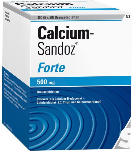 Zur Stärkung der Knochen, bei erhöhtem Bedarf während des Wachstums, Schwangerschaft und Stillzeit, hochwertige Brausetablette mit einzigartigem Calcium-Salz, hervorragende LöslichkeitPflichttext:Calcium-Sandoz® Forte 500 mg, Brausetabletten: Wirkstoff: Calcium (als Calcium-D-gluconat – Calciumlactat (2:3) 2 H2O und Calciumcarbonat). Anwendungsgebiete: Vorbeugung eines Calciummangels bei Erwachsenen, wenn eine ausreichende Calciumversorgung mit der Nahrung nicht erreicht wird; Behandlung eines Calciummangels bei Kindern ab 6 Jahren, Jugendlichen und Erwachsenen; zur Vorbeugung und unterstützenden Behandlung einer Osteoporose (Knochenschwund), wenn eine ausreichende Calciumzufuhr mit der Nahrung nicht erreicht wird; zusätzlich zu Vitamin D zur Behandlung der Rachitis (Erweichung des im Wachstum befindlichen Knochens bei Kindern) und Osteomalazie (Erweichung von Knochen bei Erwachsenen). Warnhinweis: Enthält Natrium, Sorbitol, Glucose, Schwefeldioxid. Zu Risiken und Nebenwirkungen lesen Sie die Packungsbeilage und fragen Sie Ihre Ärztin, Ihren Arzt oder in Ihrer Apotheke! Mat.-Nr.: 2/51013669-02 Stand: November 2020 Hexal AG, 83607 Holzkirchen, www.hexal.de ...