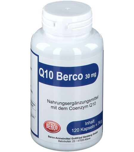 Nahrungsergänzungsmittel sind kein Ersatz für eine abwechslungsreiche und ausgewogene Ernährung und eine gesunde Lebensweise.Q10 30 mg BercoZutaten pro Kapsel:Sonnenblumenöl, Gelatine, Feuchthaltemittel: Glycerin, 30 mg Coenzym Q10, Emulgator: Glyerylmonostearat, Emulgator: Sojalecithin, Farbstoff: Eisenoxid rot.Nährwerte: Nährwertangaben pro Kapsel (= Tagesdosis) pro 100 g Kapseln % der empfohlenen Tagesdosis* Coenzym Q10 30 mg 5 g ** *gemäß Lebensmittelinformations-Verordnung **noch keine Empfehlung der EU vorhanden Verzehrempfehlung:1 Kapsel täglich unzerkaut mit ausreichend Flüssigkeit schlucken.Hinweis:Die angegebene empfohlene tägliche Verzehrmenge darf nicht überschritten werden.Aufbewahrung: Kühl (6-25 °C) und lichtgeschützt lagern. Außerhalb der Reichweite von Kindern aufbewahren.Nettofüllmenge: 120 KapselnHerstellerdaten: Berco-Arzneimittel Gottfried Herzberg GmbH Bahnhofstr. 2347533 Kleve ...