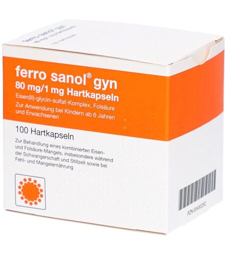 bei kombiniertem Eisen- und Folsäuremangel, insbesondere in Schwangerschaft und Stillzeit1 Kapsel enthält 80 mg Eisen plus 1 mg Folsäure Wirkstoffe: Eisen(II)-glycin-sulfat-Komplex, Folsäure.Anwendungsgebiete: Behandlung eines kombinierten Eisen- und Folsäuremangels, insbesondere während der Schwangerschaft und Stillzeit sowie bei Fehl- und Mangelernährung. ...