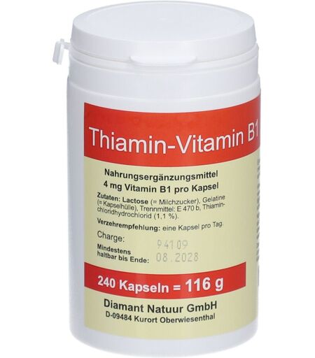 Nahrungsergänzungsmittel sind kein Ersatz für eine ausgewogene und abwechslungsreiche Ernährung und eine gesunde Lebensweise.Nahrungsergänzungsmittel 4 mg Vitamin B1 pro Kapsel.Eine Kapsel enthält 363 % der empfohlenen täglichen Verzehrsmenge für einen Erwachsenen an Vitamin B1.Zutaten:Milchzucker, Gelantine (=Kapselhülle), Trennmittel Magnesiumstearat, Thiaminchloridhydrochlorid (1,1%).Verzehrempfehlung:Eine Kapsel täglich.Hinweis:Die angegebene empfohlene tägliche Verzehrmenge darf nicht überschnitten werden.Das Produkt ist außerhalb der Reichweite von kleinen Kindern zu lagern.Nettofüllmenge (in mehreren Größen erhältlich):60 Kapseln = 29 g120 Kapseln = 58 g240 Kapseln = 116 gHerstellerVaniplant-Pharma GmbHA 1030 Wien ...