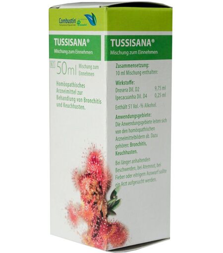 Unbenanntes Dokument Tussisana Dilution Homöopathisches Arzneimittel bei Erkrankungen der Atemorgane. Die Anwendungsgebiete leiten sich von den homöopathischen Arzneimittelbildern ab. Dazu gehören: Bronchitis, Keuchhusten. Bei länger anhaltenden Beschwerden, bei Atemnot, bei Fieber oder eitrigem Auswurf sollte ein Arzt aufgesucht werden. Zusammensetzung: Die Wirkstoffe sind: 10 ml Mischung enthalten: Drosera Dil. D2 9,75 ml Ipecacuanha Dil. D4 0,25 ml Wirkstoffe: Drosera, Cephaelis ipecacuanha Anwendung: Falls nicht anders verordnet, ist die übliche Dosis: Bei akuten Zuständen alle halbe bis ganze Stunde, höchstens 12-mal täglich, je 5-10 Tropfen einnehmen. Hinweis: Enthält 51 Vol.-% Alkohol Nettofüllmenge: 50 ml Herstellerdaten: COMBUSTIN Pharmazeutische Präparate GmbH Offinger Straße 7 88525 Hailtingen ...