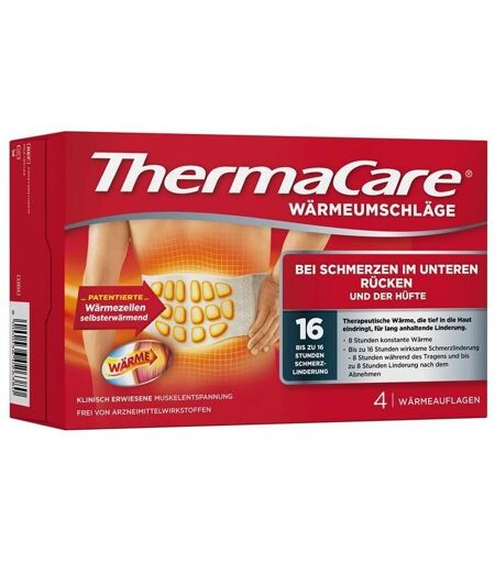 ThermaCare® Wärmeumschläge für den unteren Rücken, bei Schmerzen im unteren Rücken und der Hüfte Die ThermaCare Wärmeumschläge bei Schmerzen im unteren Rücken und der Hüfte eignen sich besonders gut zur Behandlung von Verspannungen im unteren Rücken. Die hautfreundlichen Umschläge mit 16 patentierten Wärmezellen sind dank des elastischen Materials und Klettverschlusses stufenlos größenverstellbar. Bis zu 16 Stunden Schmerzlinderung Effektiv ohne Arzneiwirkstoffe Wirksamer als 1200 mg Ibuprofen am Tag* Flexibler Klettverschluss Elastischer Gurt (von S bis XL dehnbar) *Quelle: Nadler et al. Spine. 2002:27(10): 1012-7. **Meistverkaufter Wärmeumschlag in Deutschland, Quelle: IQVIA MAT 12/2023. Gebrauchsanweisung: Reißen Sie den Beutel unmittelbar vor Gebrauch auf. Schneiden Sie nicht in den Wärmeumschlag. Legen Sie den Wärmeumschlag mit den dunkleren Wärmezellen zur Haut hin auf die schmerzende Stelle und befestigen Sie ihn. Siehe Abschnitt "Nicht verwenden" im Hinblick auf Körperstellen, an denen die Wärmeumschläge nicht verwendet werden dürfen. Es kann bis zu 30 Minuten dauern, bis ThermaCare seine therapeutische Temperatur erreicht. Entfernen Sie den Wärmeumschlag nach 8 Stunden. Zweckbestimmungen: Wirksame und gezielte Linderung von Muskel- und/oder Gelenksschmerzen im Zusammenhang mit: Überanstrengung Zerrungen und Verstauchungen Arthrose Muskelverspannungen Geeignet bei akuten, chronischen und gelegentlichen Schmerzen. Dieses Produkt ist für Patient:innen ab 12 Jahren bestimmt, die das Produkt selbstständig anwenden können. Siehe besondere Warnhinweise und Vorsichtsmaßnahmen für die Anwendung. Besondere Warnhinweise und Vorsichtsmaßnahmen für die Anwendung: Dieses Produkt kann zu Verbrennungen/Blasen führen. Kontrollieren Sie Ihre Haut während der Anwendung regelmäßig. Wenn Sie Hautreizungen oder Verbrennungen feststellen, entfernen Sie das Produkt sofort. Für Anwender:innen, die das Produkt nicht selbstständig anwenden können, bzw. für Anwender:innen zwischen 12 und 18 Jahren: Es ist eine Beaufsichtigung durch eine Betreuungsperson erforderlich. Ihr Risiko für Verbrennungen steigt mit zunehmendem Alter. Wenn Sie 55 Jahre oder älter sind, tragen Sie ThermaCare über dünner Kleidung und nicht während Sie schlafen. Sprechen Sie vor der Anwendung mit Ihrem Arzt/Ihrer Ärztin, wenn Sie an Diabetes, Durchblutungsstörungen, Herzerkrankungen oder rheumatoider Arthritis leiden oder wenn Sie schwanger sind. Beenden Sie die Anwendung und sprechen Sie mit Ihrem Arzt/Ihrer Ärztin, wenn Sie im Anwendungsbereich Beschwerden, Verbrennungen, Schwellungen, Ausschläge oder andere anhaltende Veränderungen Ihrer Haut feststellen, und wenn Ihre Schmerzen länger als 7 Tage anhalten oder sich verschlimmern. Jede Wärmezelle enthält Eisenpulver (ca. 2 g). Bei Verschlucken bitte sofort professionelle Hilfe in Anspruch nehmen. Bei Haut- oder Augenkontakt den Wärmeumschlag entfernen, den betroffenen Bereich mit Wasser spülen und sofort professionelle Hilfe in... ...