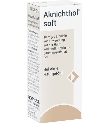 Die hautgetönte AKNICHTHOL® SOFT Lotio enthält Natriumbituminosulfonat (ICHTHYOL®-Natrium), hell, 1%.wirkt antibakteriell wirkt antientzündlich vermindert die Talgproduktion nicht phototoxisch frei von Alkohol Make-up Effekt, da getöntAnwendung:2-3 x täglich punktgenau auf die erkrankten Stellen auftragenZusammensetzung:100 g Emulsion enthalten: Wirkstoff: Natriumbituminosulfonat (ICHTHYOL®-Natrium), hell 1 g. Sonstige Bestandteile:Salicylsäure, mittelkettige Triglyceride, Macrogol-4-laurylether, α-(Octadec-9-enyl)-ω-hydroxypoly(oxyethylen)-5, Macrogol-7-glycerolcocoate, Maisstärke, hochdisperses Siliciumdioxid, Titandioxid (E 171), Eisenoxide und Eisen(III)-hydroxid-oxid (E 172), Lavendelöl, Butylhydroxytoluol, gereinigtes Wasser.Anwendungsgebiete: Zur Verminderung der Komedonenzahl bei leichter und mittelschwerer Akne vulgaris. Gegenanzeigen: Nachgewiesene Überempfindlichkeit gegen sulfonierte Schieferöle, wie z. B. Ammoniumbituminosulfonat und/oder Natriumbituminosulfonat, Salicylsäure, Salicylate oder einen der anderen sonstigen Bestandteile sowie Schwangerschaft und Stillzeit. Nebenwirkungen: In sehr seltenen Fällen (< 0,01 %) kann es bei der Anwendung von AKNICHTHOL® SOFT zu Unverträglichkeitsreaktionen der Haut kommen. In sehr seltenen Fällen (< 0,01 %) kann es zu einer Kontaktallergie kommen. Warnhinweis:Enthält Butylhydroxytoluol. ...
